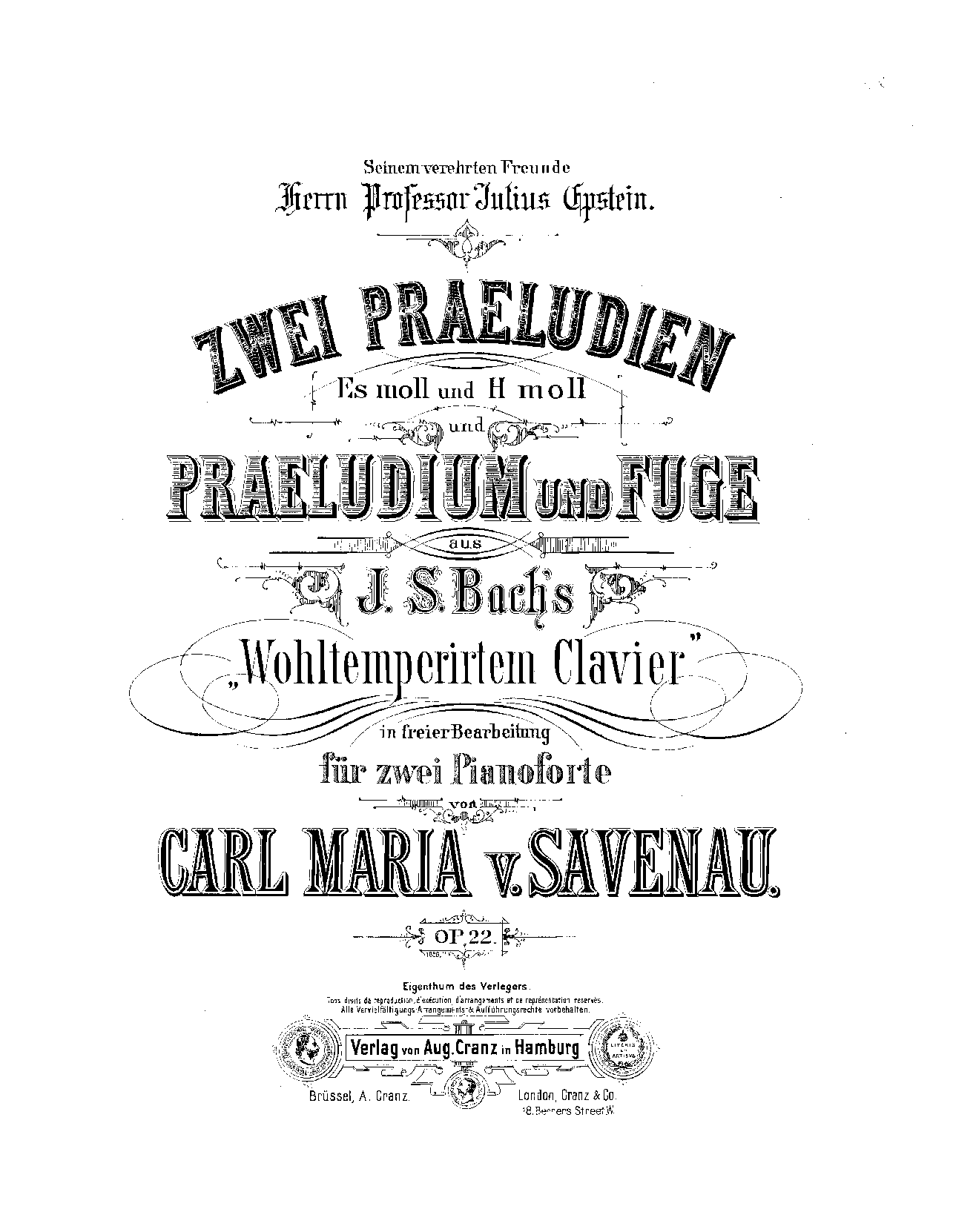 Zwei Praeludien (Es moll und H moll) und Praeludium und Fuge aus J.S. Bach’s 'Wohtemperirtem Clavier' in freier Bearbeitung für zwei Pianoforte