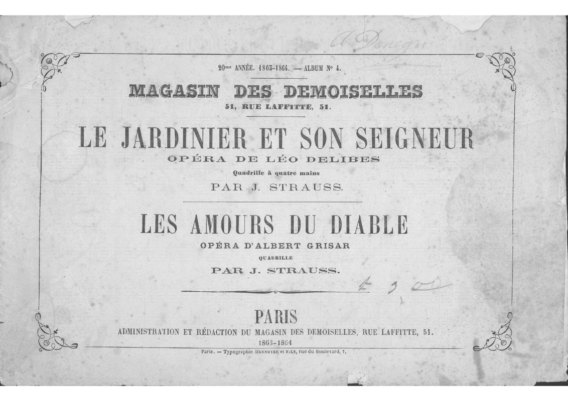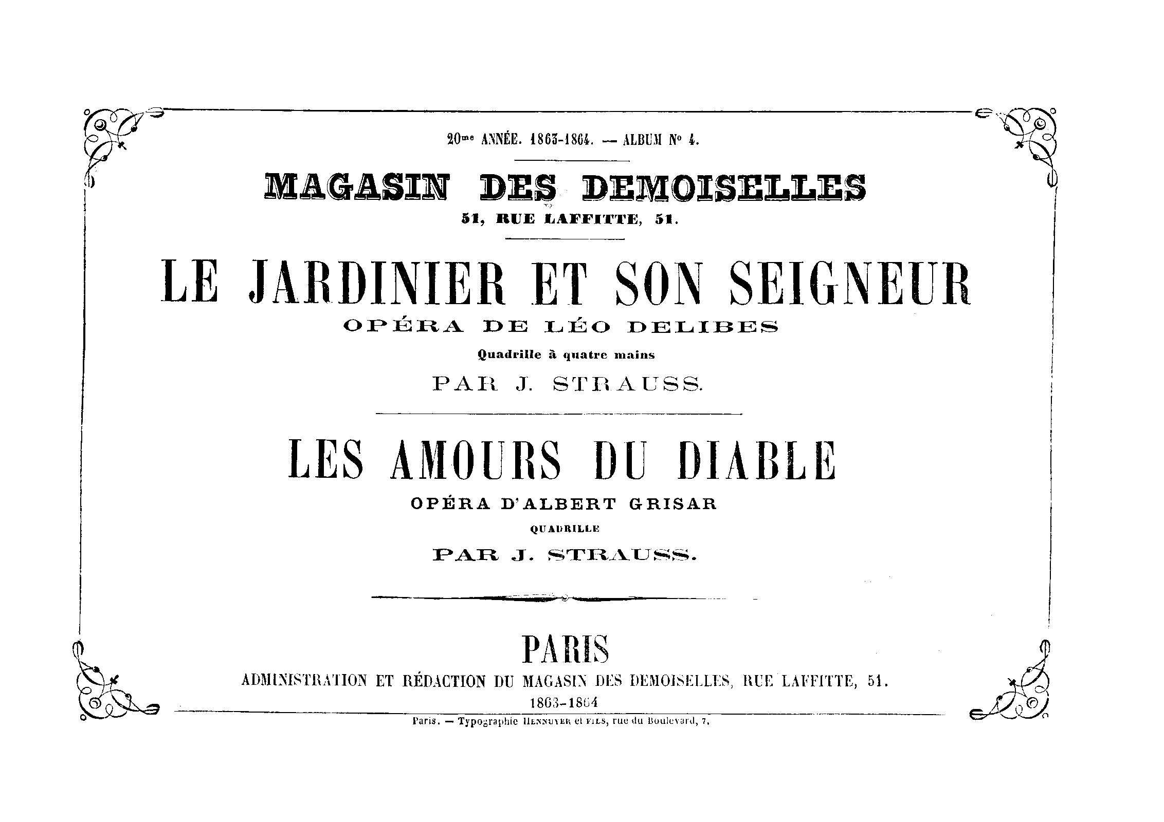 | Alternative. Title | Le Jardinier et son Seigneur. Opéra de Léo Delibes.Quadrille à quatre mains. Les amours du Diable. Opéra d'Albert Grisar. Quadrille. |