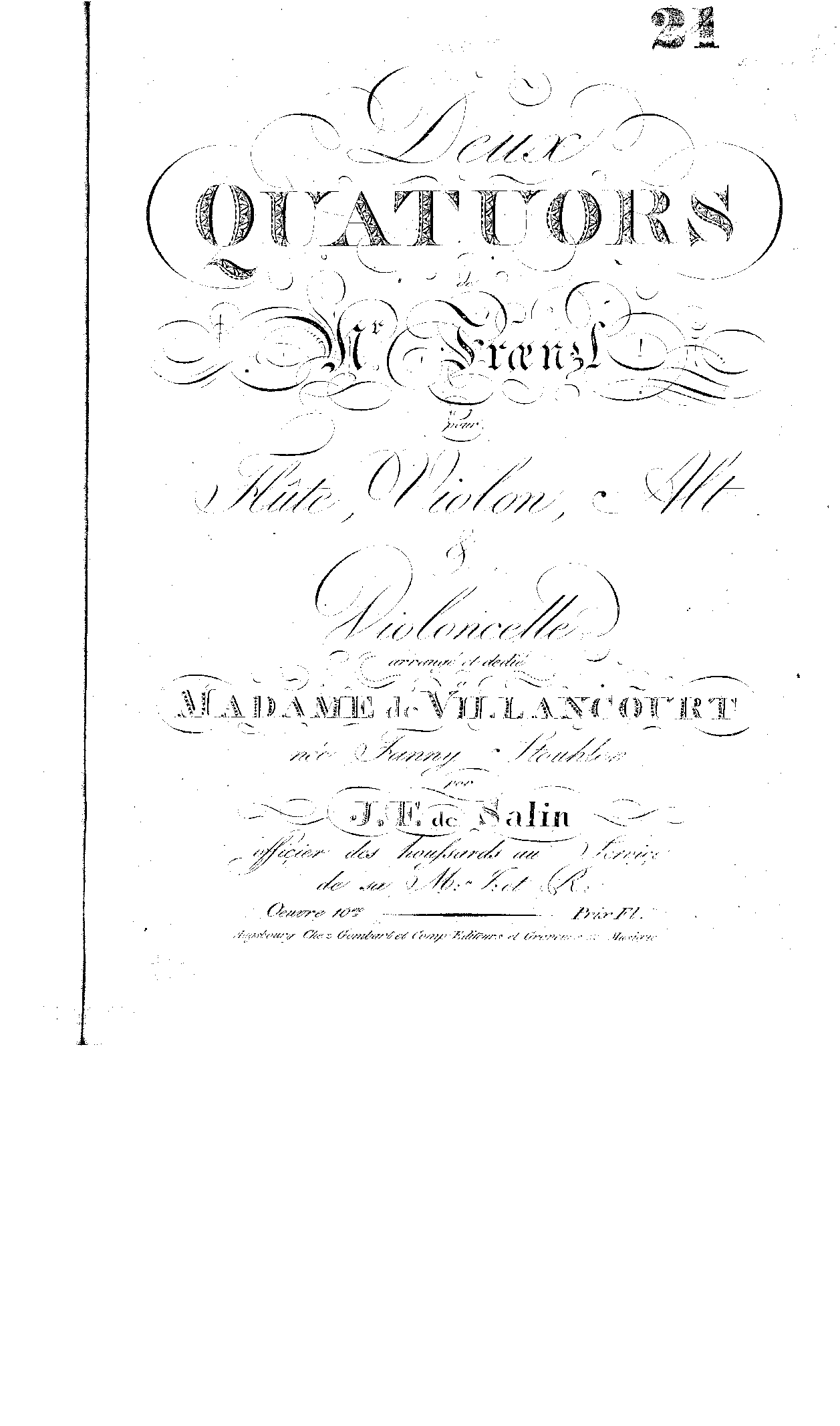 | Genre Categories | Quartets; For flute, violin, viola, cello; Scores featuring the flute; |