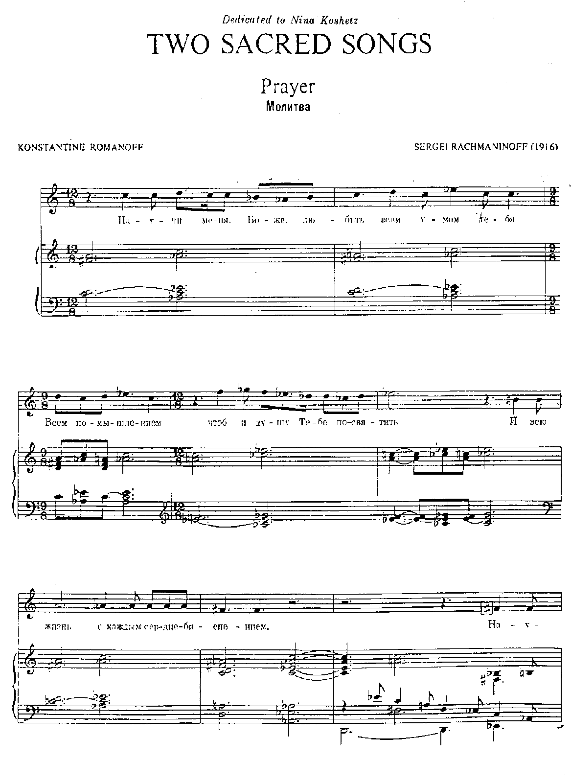 After drafting the Opus 38 songs, Rachmaninoff evidently gave to Nina Koshetz the pencil sketches to two “sacred” songs. After Koshetz died in 1965, her daughter Marina Koshetz (1912–2001) donated them to the Rachmaninoff collection in the Library of Congress in 1970.