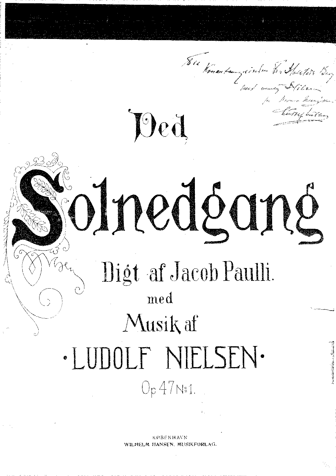 The first song "Ved Solnedgang" - "At sunset" is one of Ludolf Nielsens most popular song. It was published for Voice and piano, mixed choir, male choir, and voice with orchestra. The version for orchestra on IMSLP is perhaps the first official release. The only known copies are probably private copies by the composer himself. The second "Vi elsker vort blomstrende Fædreland" was published for voice and piano, mixed choir and male choir.