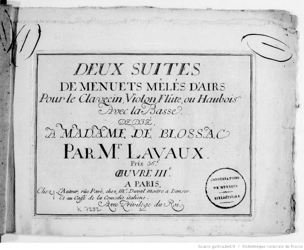 | Work Title | 2 Suites de menuets mêlés d'airs pour le clavecin, violon, flûte ou hautbois avec la basse |