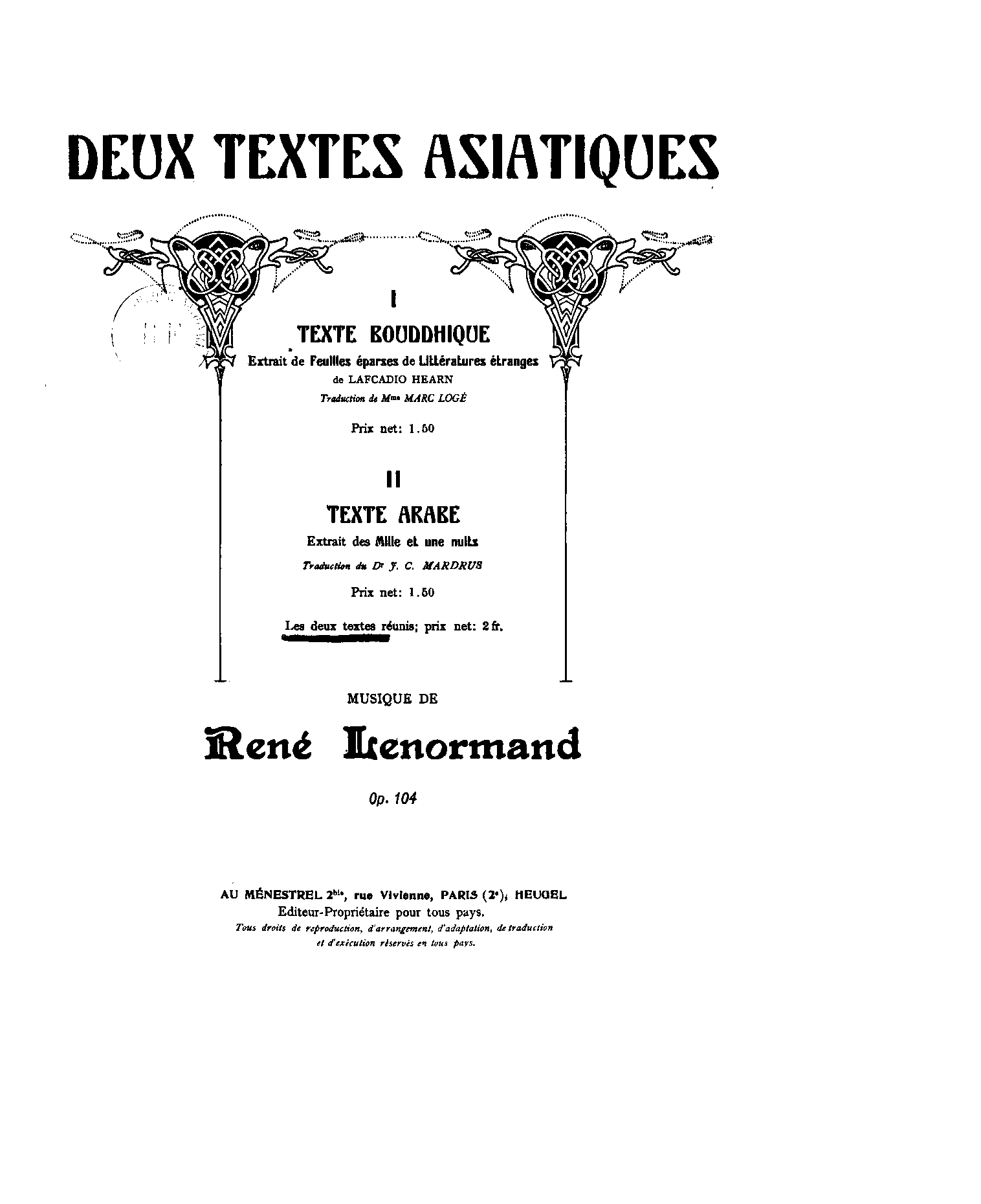 | Librettist | 1. Madame Marc Logé, after Lafcadio Hearn 2. Le Docteur Mardrus, after 1001 Nights |