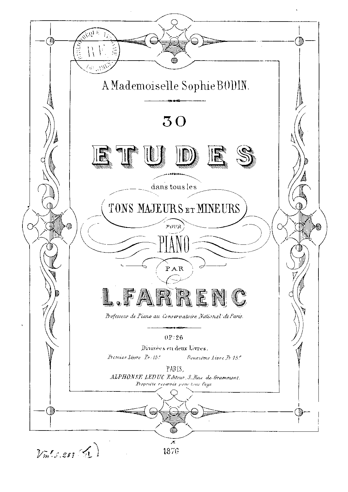 | Extra Information | According to Fétis, Sophie Bodin later became Sophie Pierson (or Sophie Pierson-Bodin from other sources) ; she may have died in 1877 or so. BNF also has the first edition- see BNF link (all 30 etudes, Farrenc plate A.F. 661. This suggests a 1839 ca. publication date?). Composed 1835-8 according to Legras ("Louise Farrenc, compositrice du XIXe siècle"), p.93 and published 1839-40 (same source). |