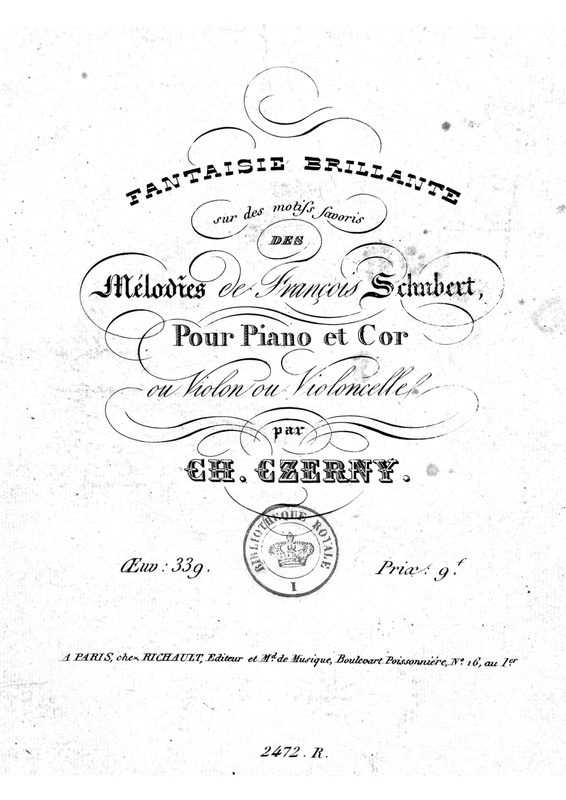 Contains Der Erlkönig (Le Roi des Aulnes) Op.1. Possibly all published in 1834? Note that HMB 1834, p.92 has "3 brillante Fantasien über die beliebtesten Motive aus Franz Schubert’s Werken f. Pfte u. Waldhorn (oder Violine oder Vclle.)" even though only one seems to have been offered for sale at the time. (Maybe worth checking other sources besides HMB, here...)