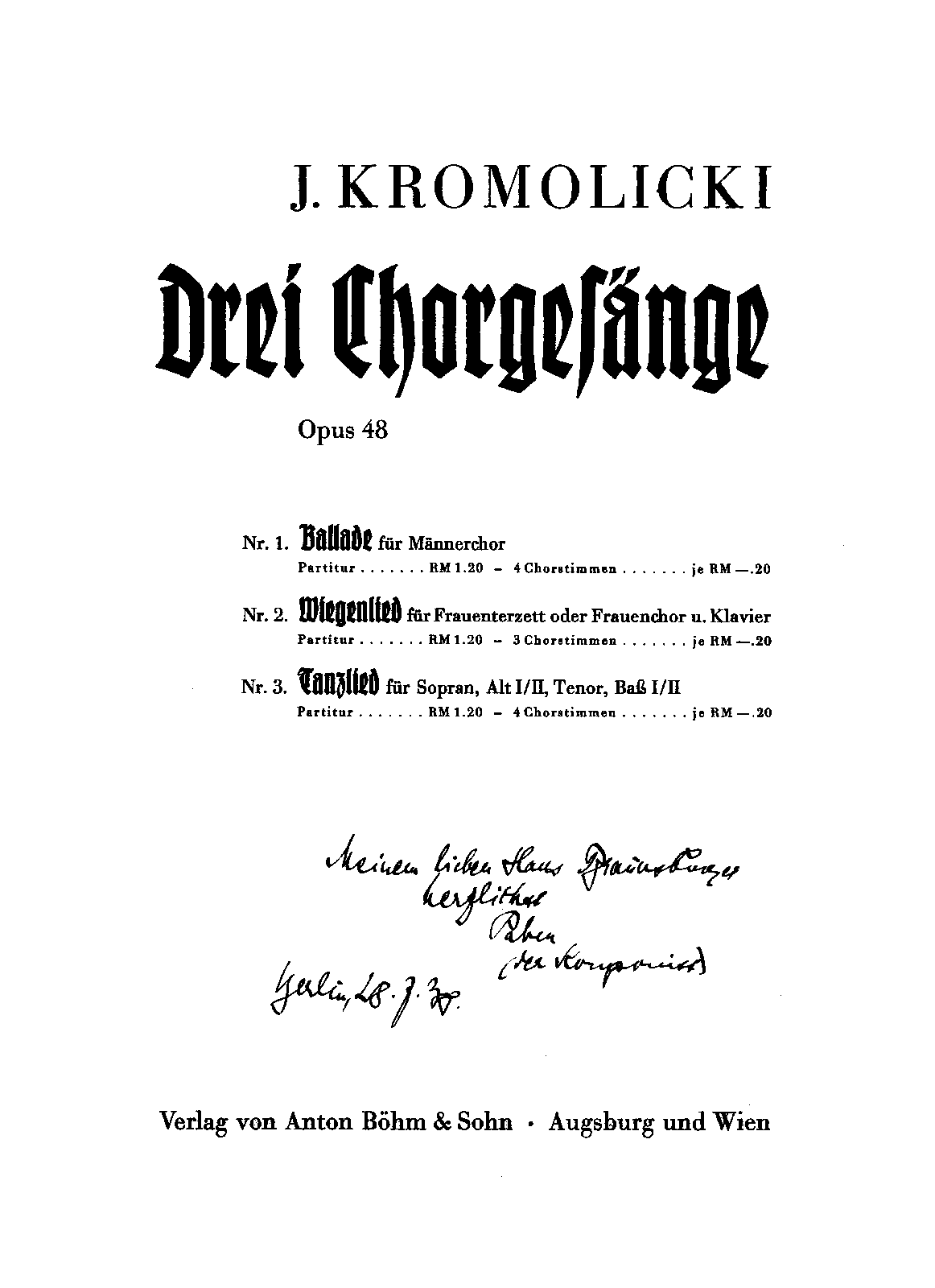 | Instrumentation | 1. male choir 2. female terzett or female choir, piano 3. SAATBB |