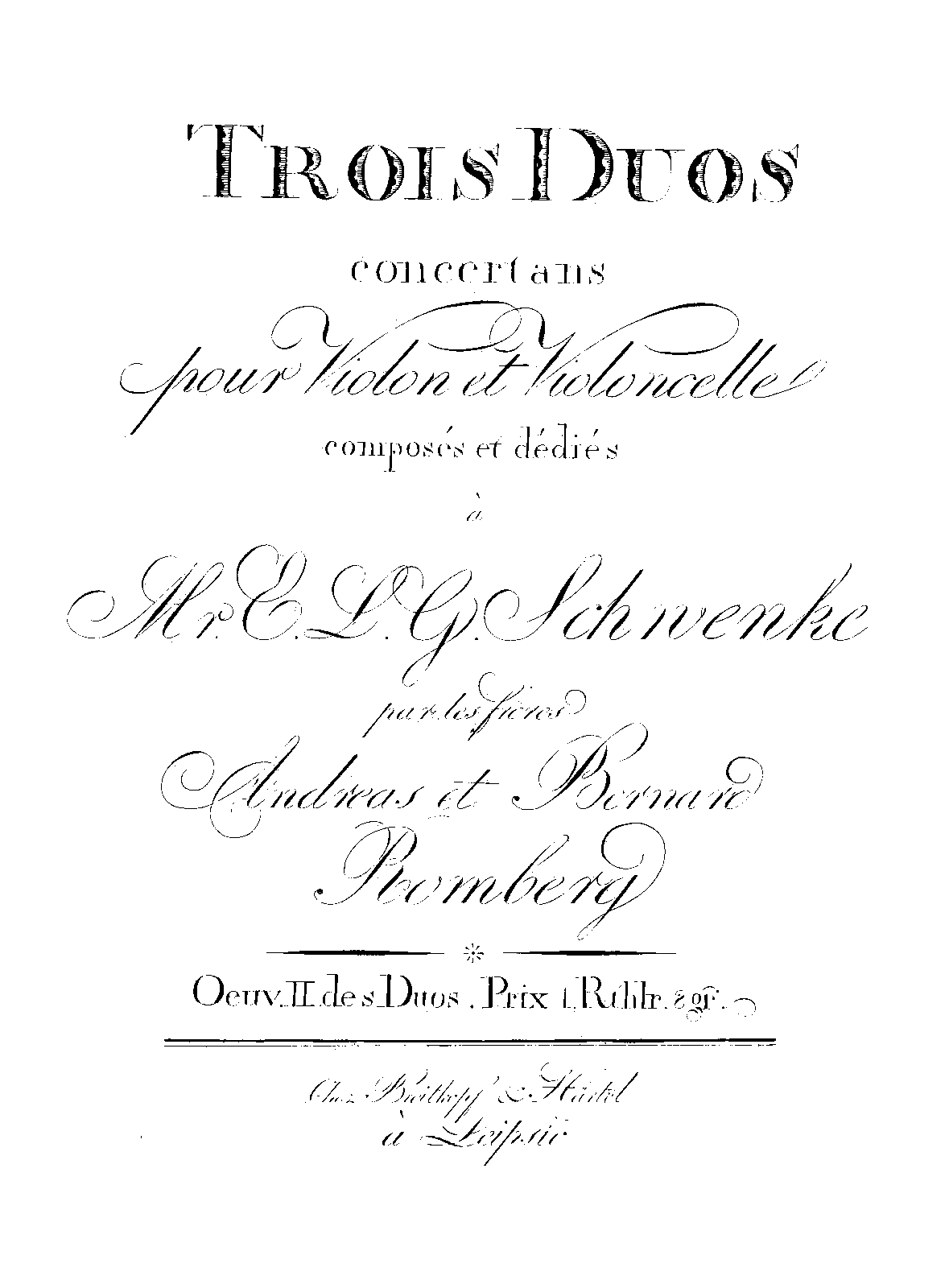 | Alternative. Title | 3 konzertante Duos; 3 Concertante Duos; Trois duos concertans pour violon et violoncelle |
