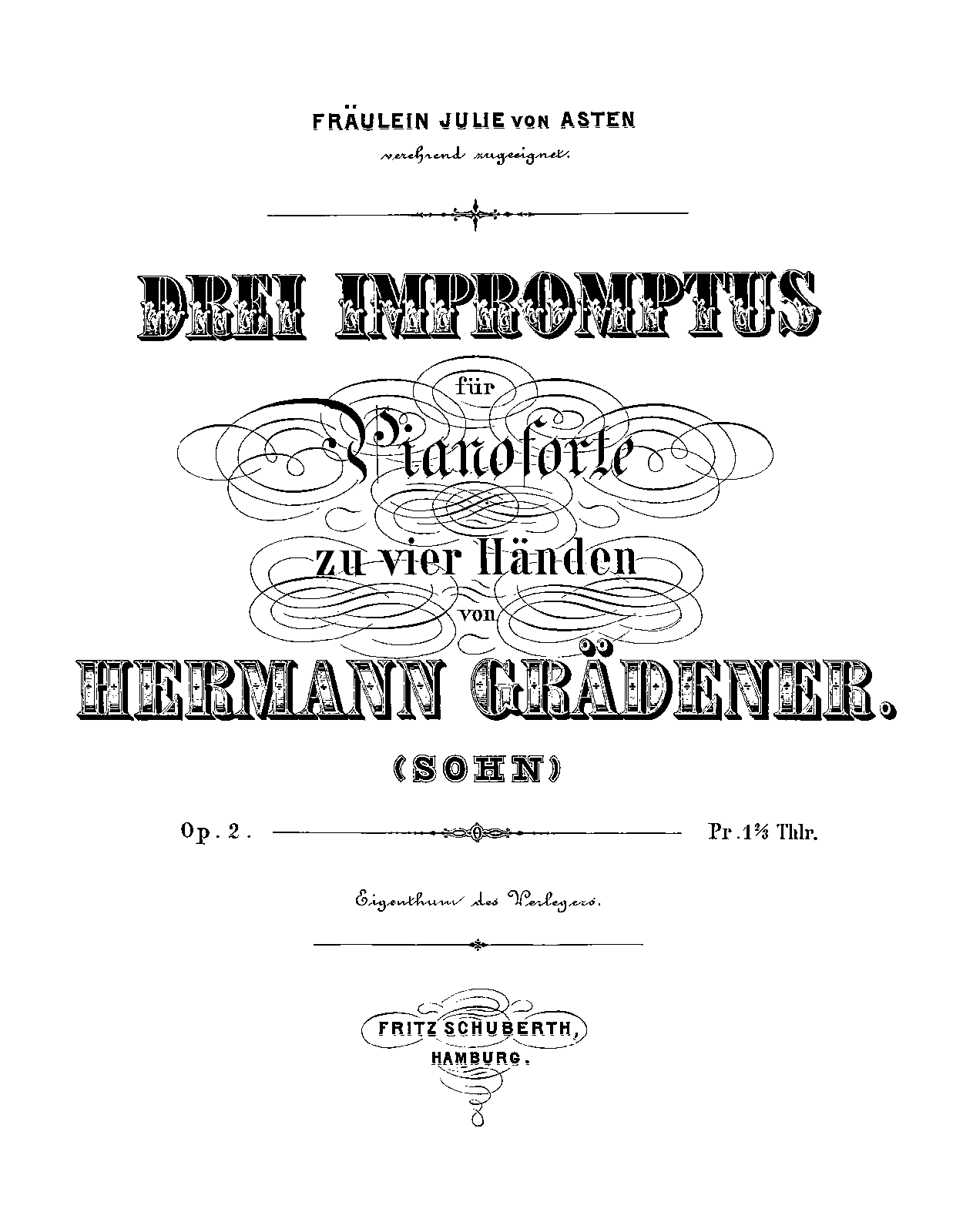 | Alternative. Title | Drei impromptus für Pianoforte zu vier Händen |