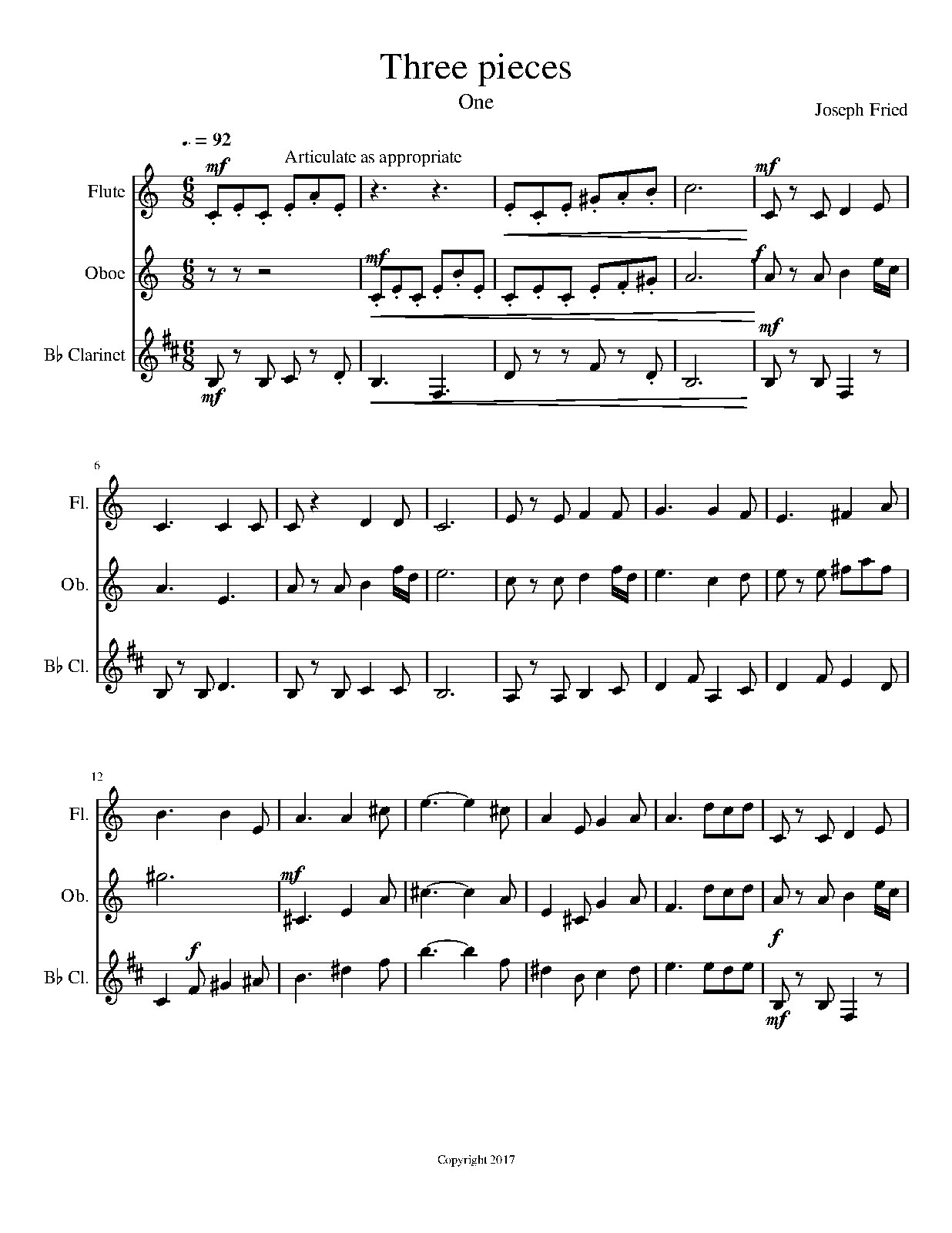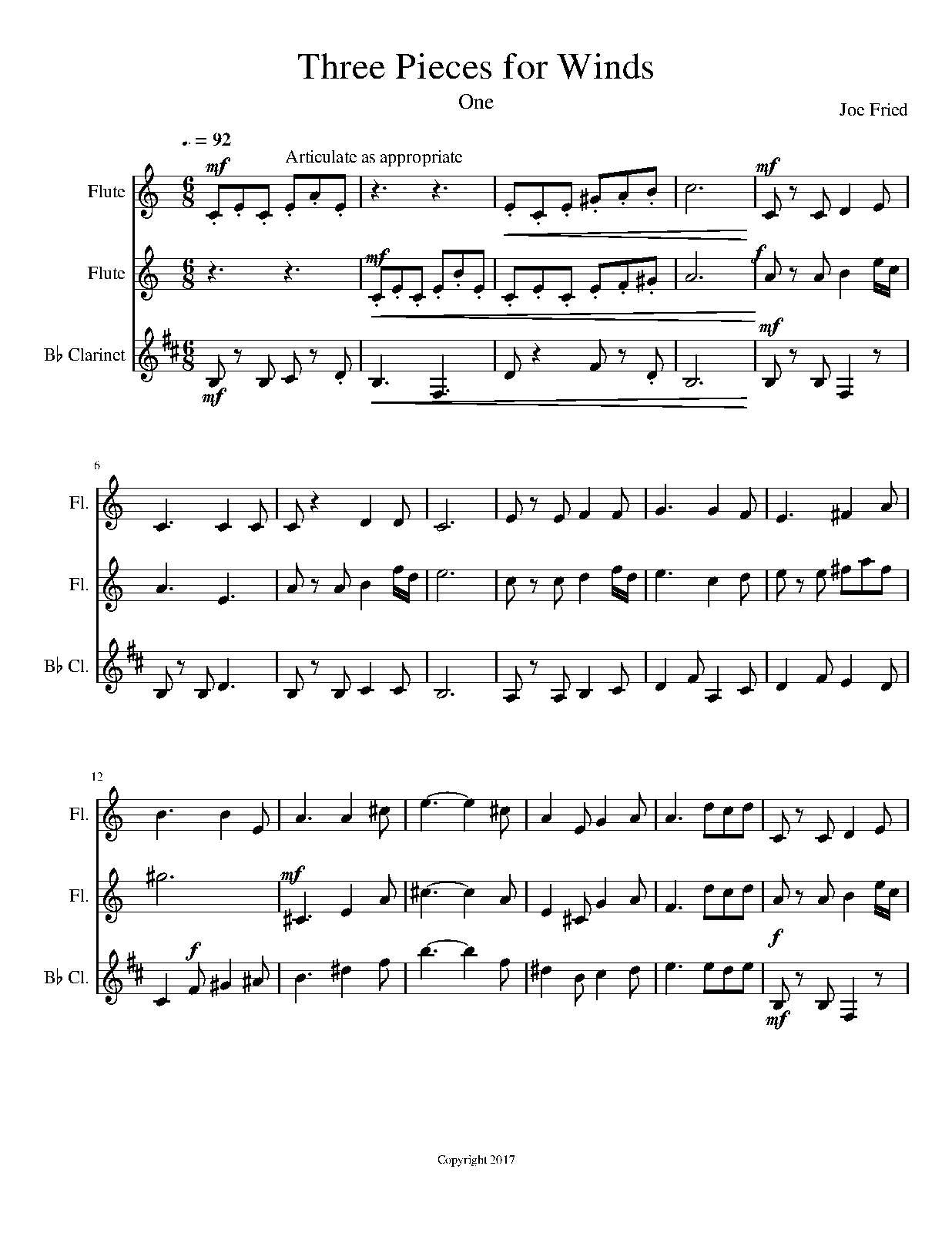 This wind trio can be played with a Bb clarinet, oboe, and flute. Alternatively, it can be played with a Bb clarinet and 2 flutes. If you have comments or suggestions regarding this music feel free to contact the composer at joefried1@gmail.com.