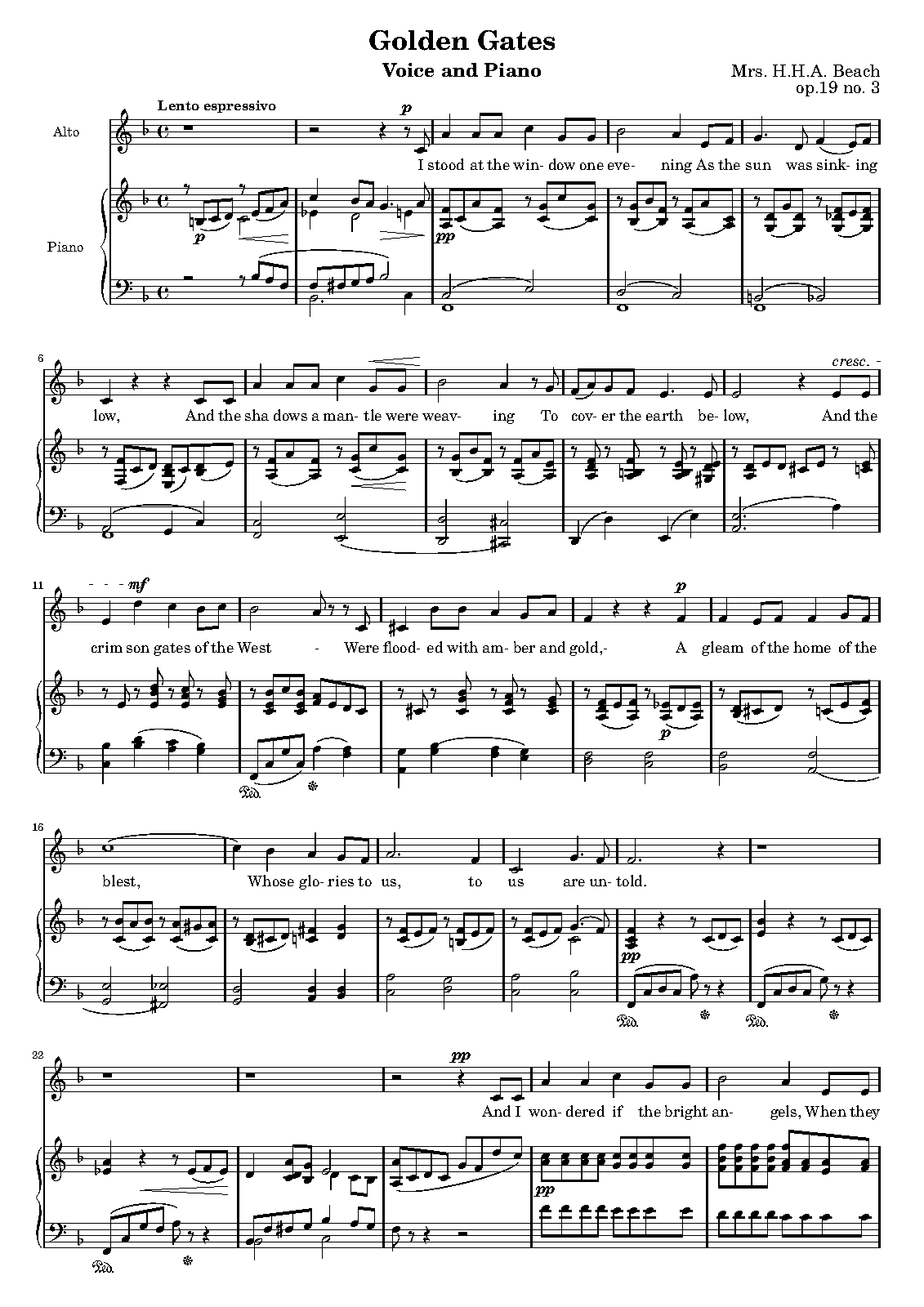 | Extra Information | The poem Golden Gates was published in Our Dumb Animals--a journal published by the Massachusetts Society for the Prevention of Cruelty to Animals. Ecstasy was also published in a version with violin obbligato. |