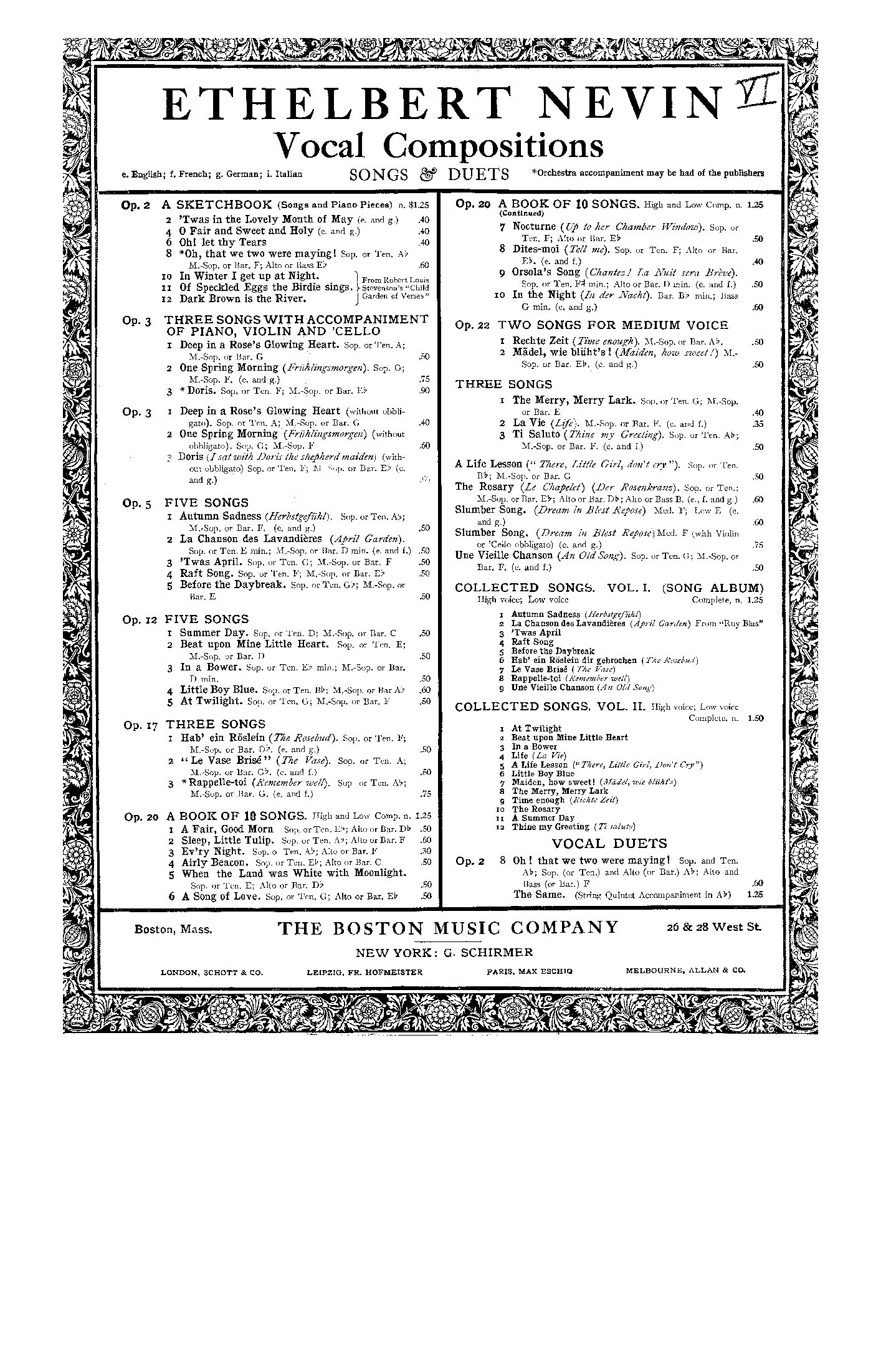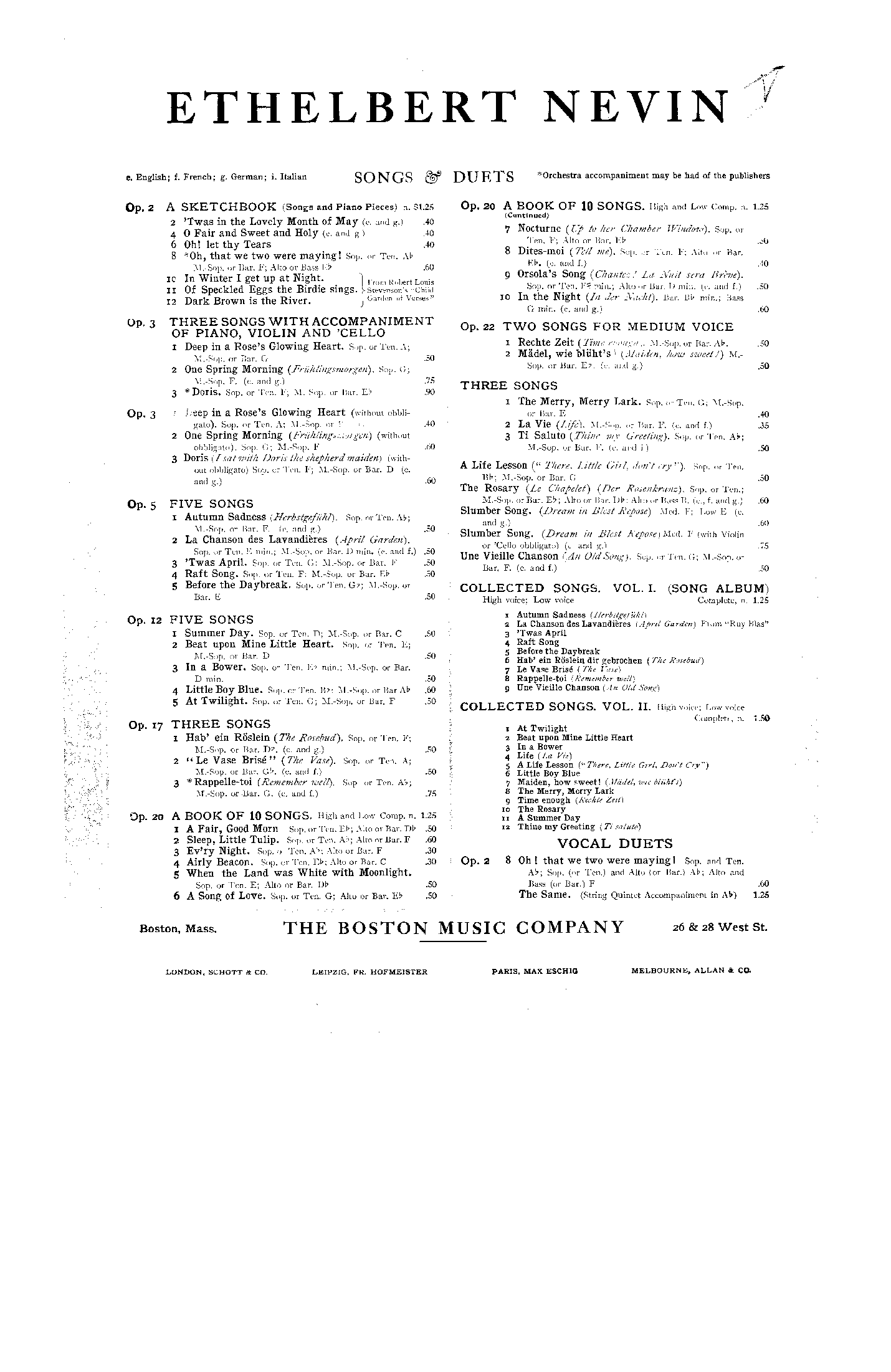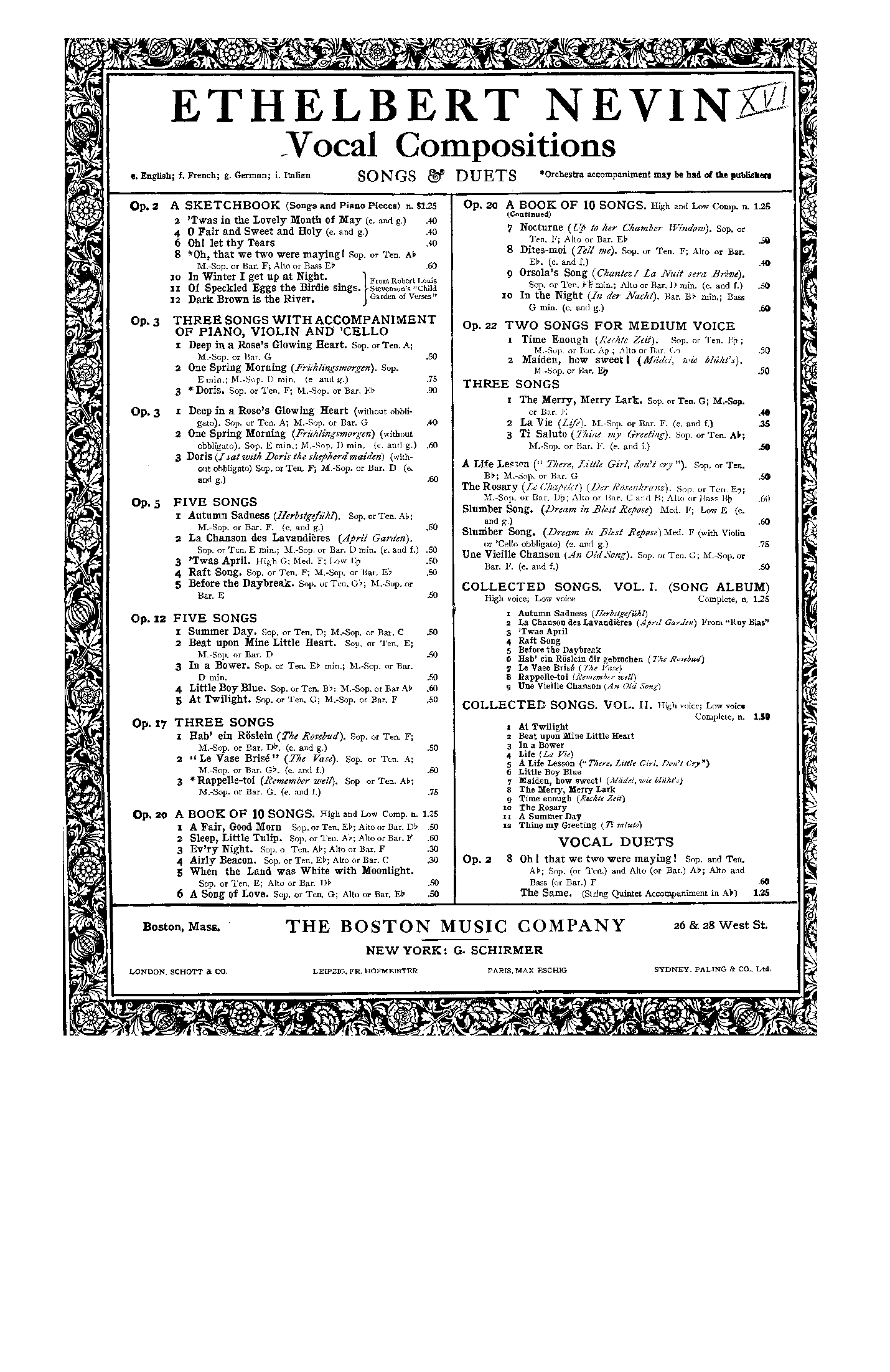 | Genre Categories | Songs; For voice, piano; For voices with keyboard; |