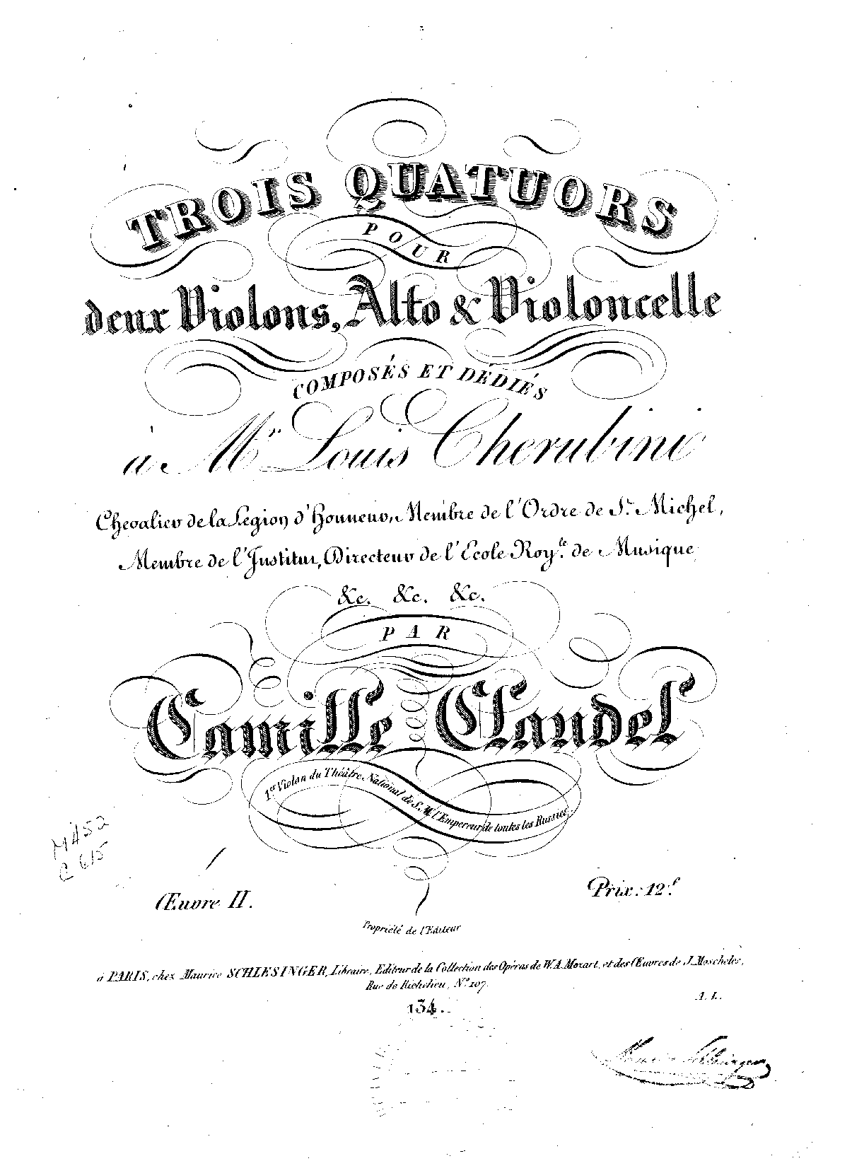 Sibley comically attributes this to the sculptress Camille Claudel (1864-1943). Not only she wasn't a composer, but this music also dates from a century earlier. Unfortunately, her much more famous name "pollutes" all the info @Google, so it's very hard to find information about the real composer (who was probably male, not female). The only thing that's certain is that these quartets were published before 1842 (ca.) since Cherubini died that year, and the music is dedicated to him while he was still alive. - R.P.