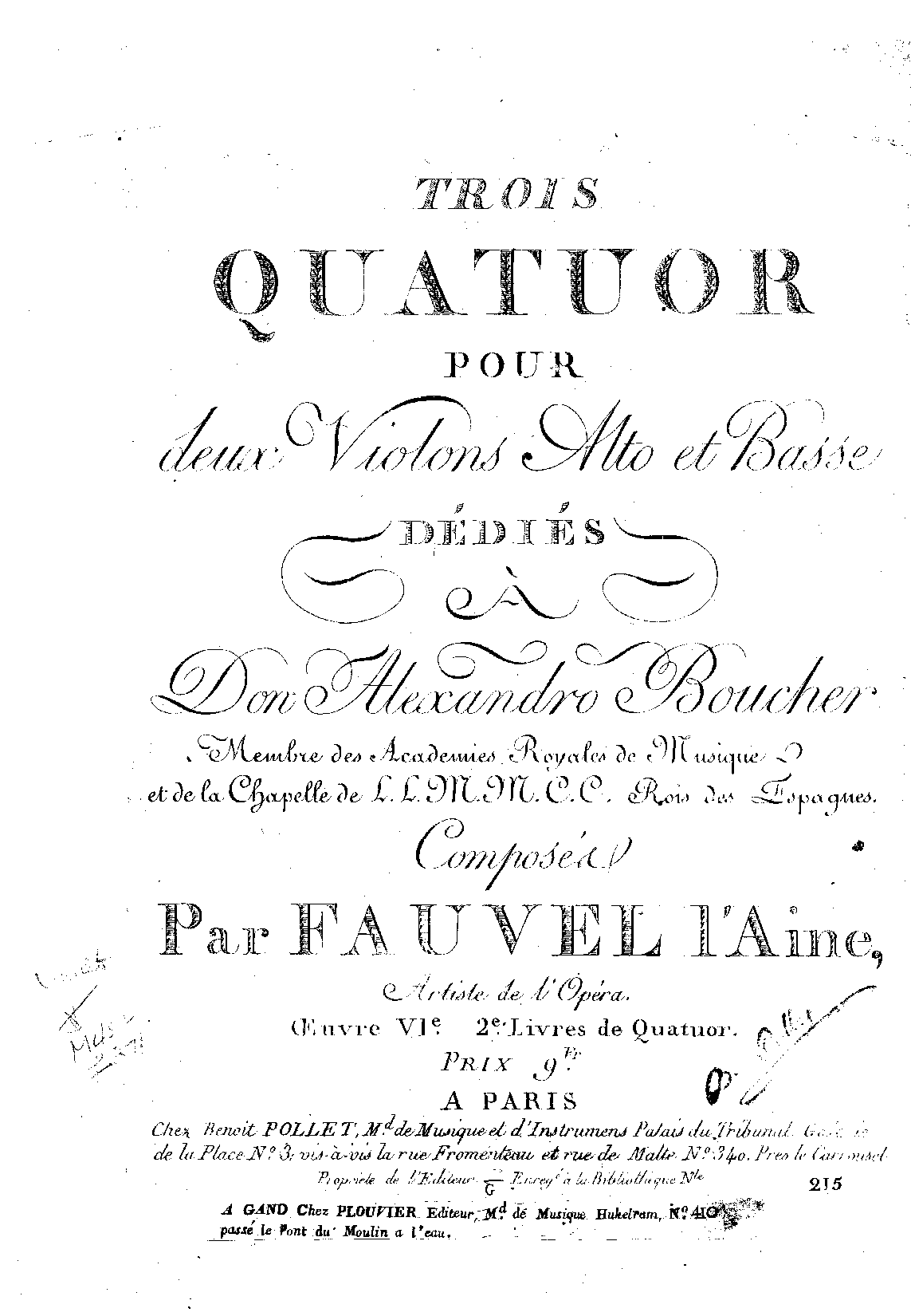 | Alternative. Title | Trois quatuor pour deux violons, alto et basse, oeuvre VI, 2e livres de quatuor |