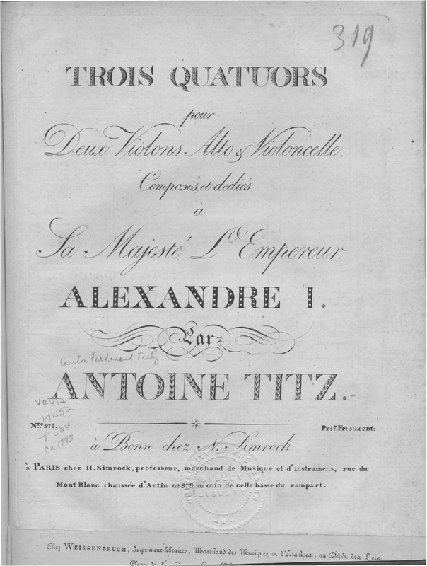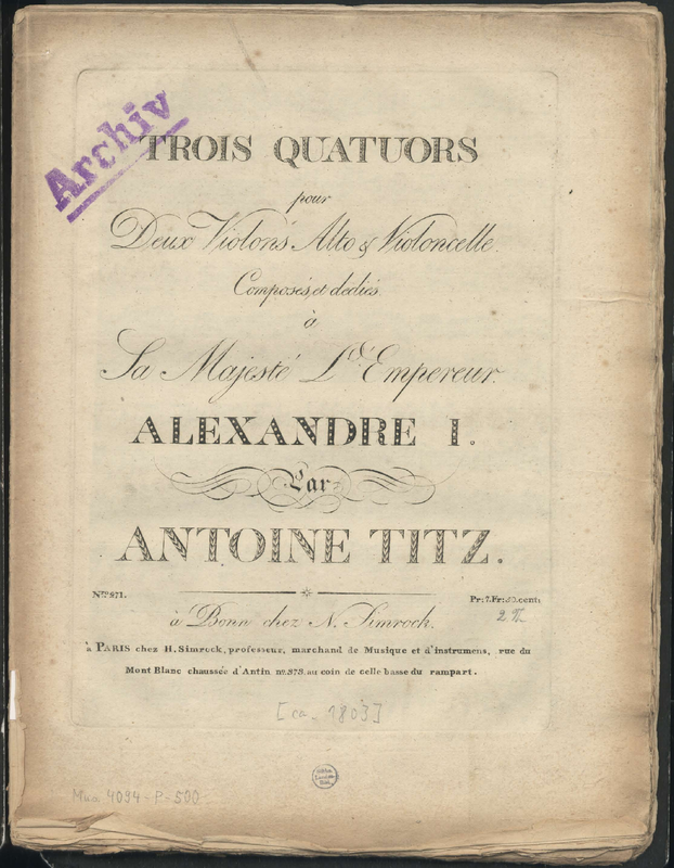 Titz' quartets have been recorded by Hoffmeister Quartet on the Profil CD label. Nos. 1 and 3 of this set - identified as nos. 1 and 3 of Trois quatuors 1802 - are on WorldCat, together with 2 of his 6 string quartets published in 1781 (his Op.1). Durations 23 minutes and 18 minutes.) ; no.2 is on the 2nd disc of the set. - Schissel