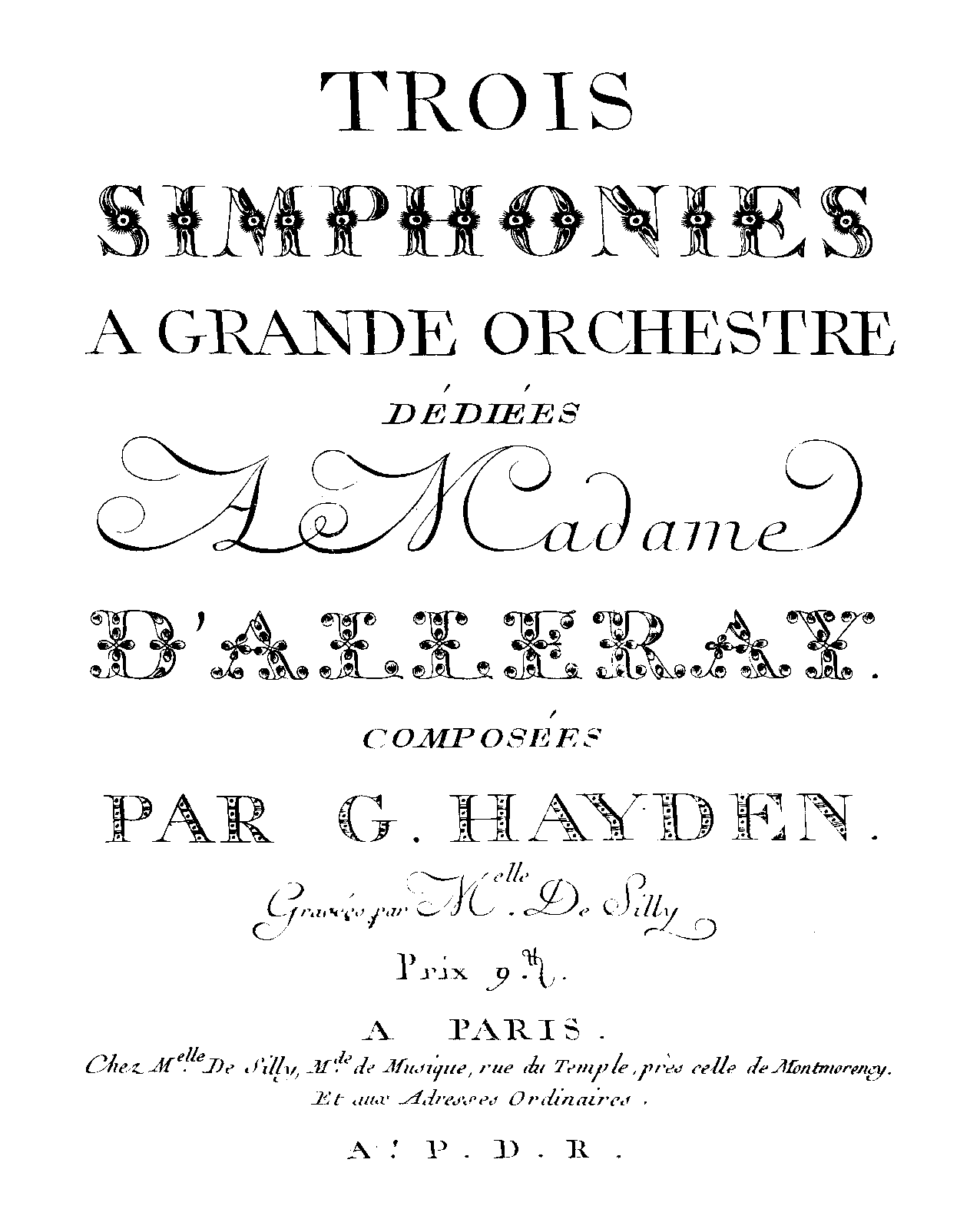 | Alternative. Title | Trois Simphonies à grande orchestre dédiées à Madame D'Alleray |
