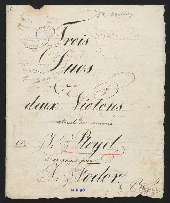 | Alternative. Title | Trois duos pour deux violons extraits des oeuvres de I: Pleyel et arrangés por I: Fodor |