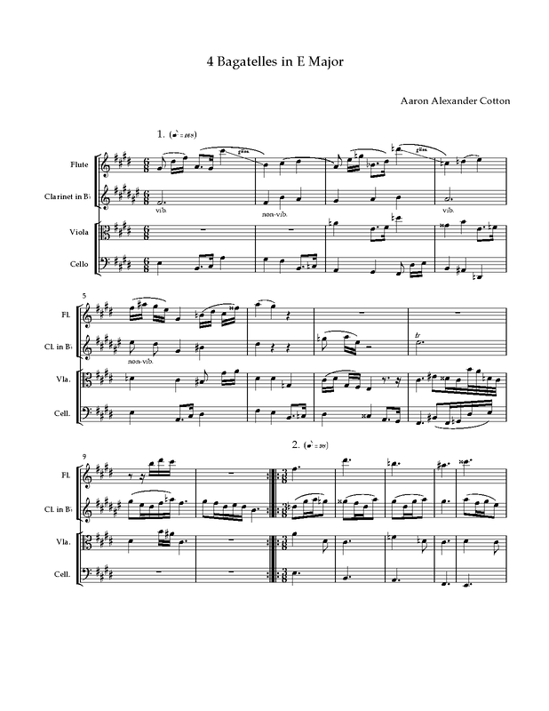 | Work Title | 4 Bagatelles in E Major (for flute, clarinet; viola, cello) |