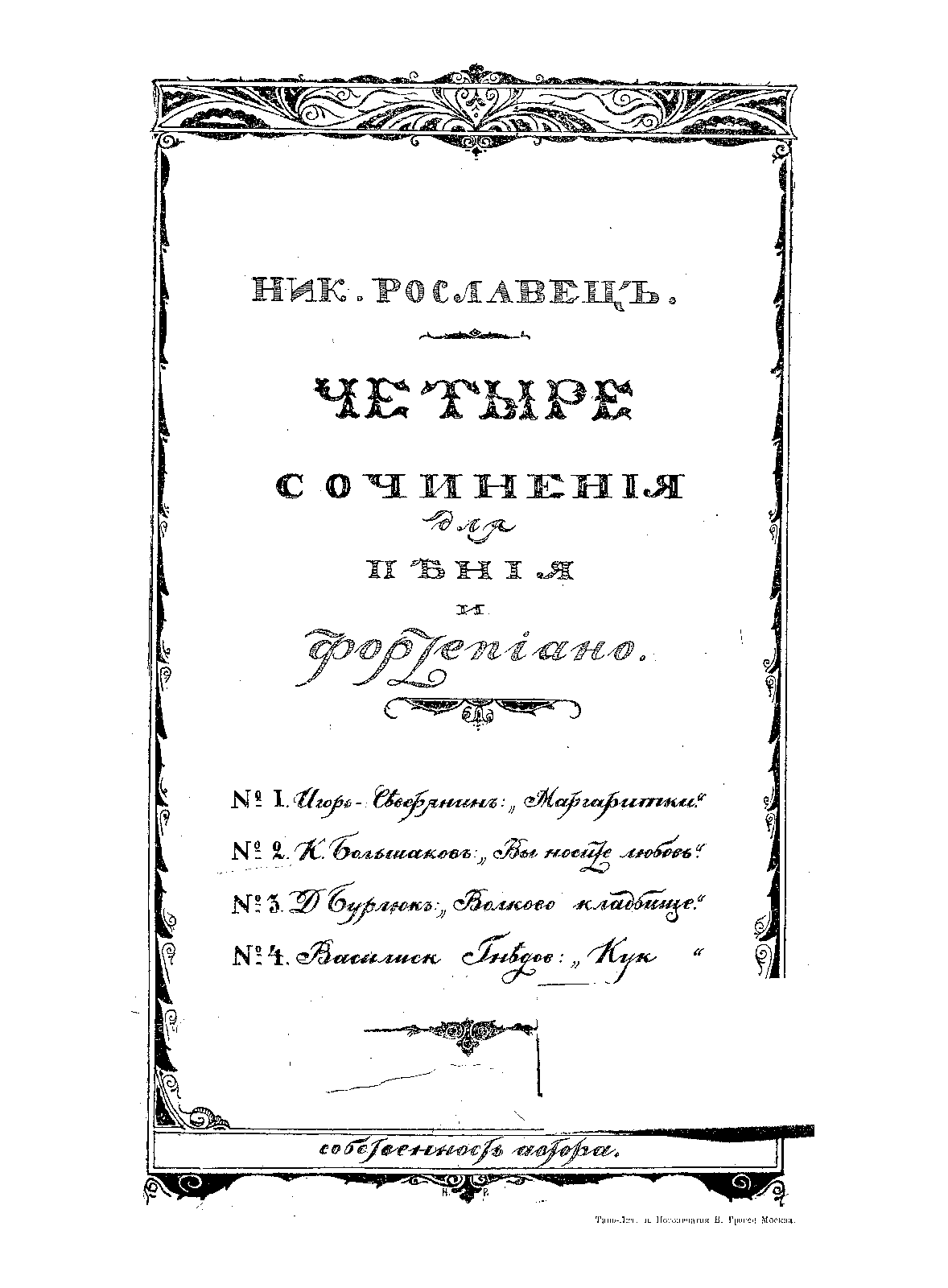 | Librettist | 1. Igor Severyanin (1887–1941) 2. Konstantin Bolshakov (1895–1938) 3. David Burlyuk (1882–1967) 4. Vasilisk Gnedov (1890–1978) |