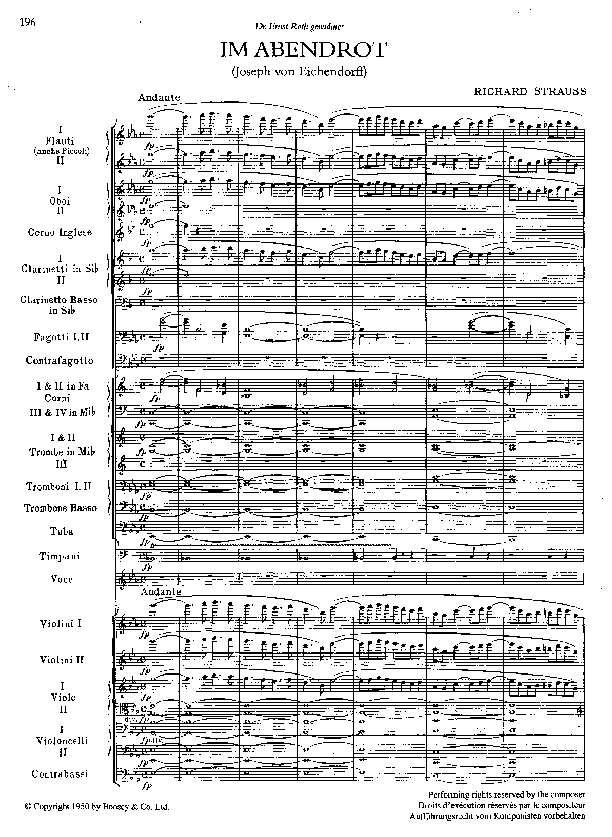 [*] Typical performance practice rearranges the confusing piccolo doublings by assigning the piccolo passages in the first and second parts at the end of Im Abendrot (No.4) to the third and fourth players (the principal and second players never touch piccolos). The inaptly named Piccolo 2 part is played by the fourth player, who only plays piccolo.