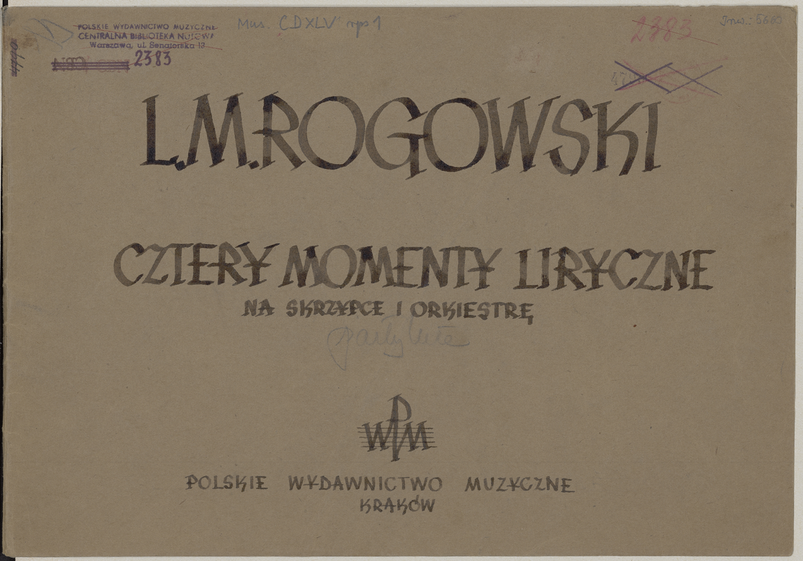 | Alternative. Title | Quatre Moments Lyriques pour violon avec l'orchestre; Cztery momenty liryczne na skrzypce i orkiestrę; [Four lyrical moments for violin and orchestra]; |