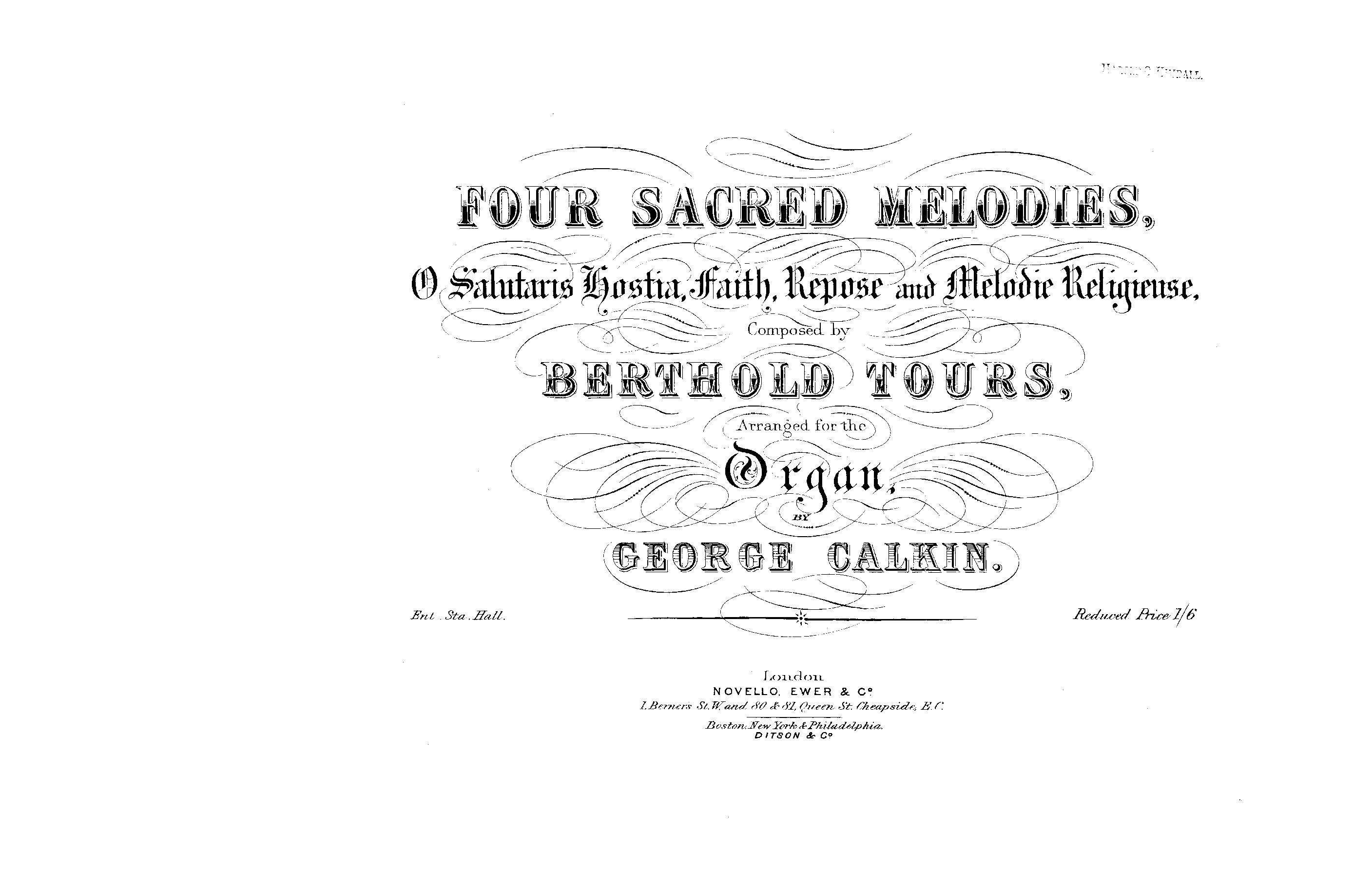 | Alternative. Title | Four Sacred Melodies: O salutaris hostia, Faith, Repose, Melodie relogieuse, composed by Berthold Tours, arranged for the Organ by George Calkin |