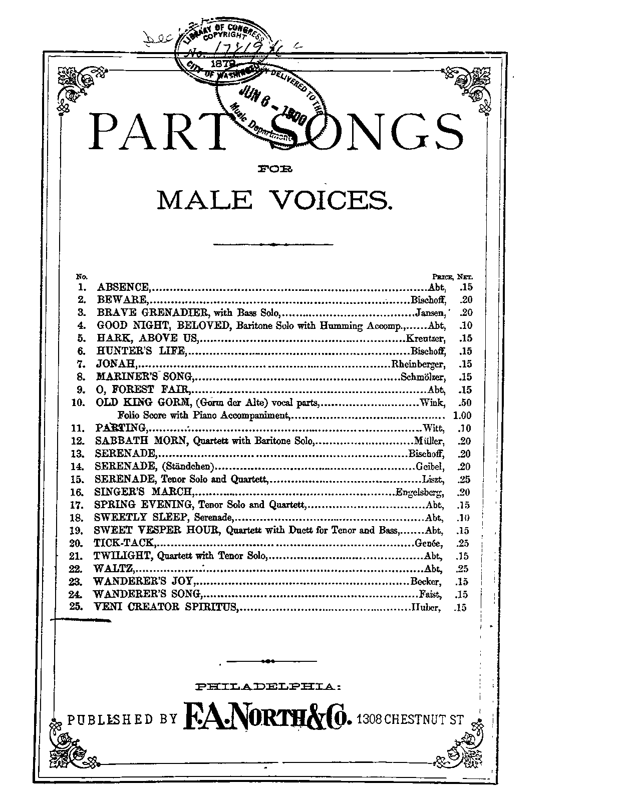 | Genre Categories | Songs; For male chorus; Scores featuring male chorus; |