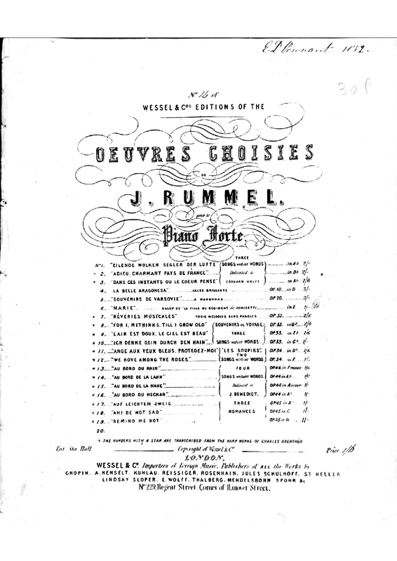 | Extra Information | Arrangements of harp pieces by Oberthür with his opus number (not clear if Rummel 'adopted' the opus number himself). Dedication seems to be peculiar to these arrangements. |