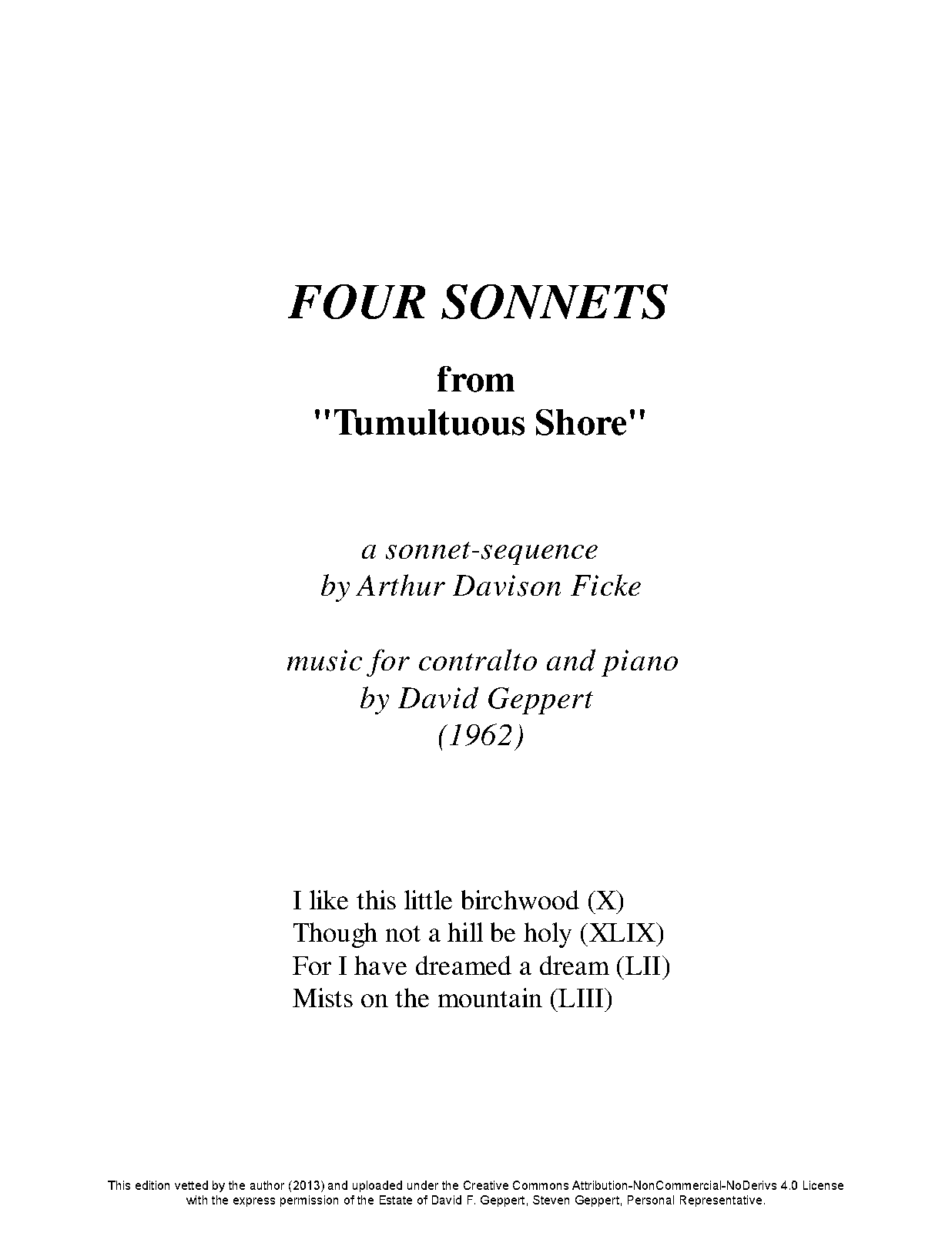 The cycle was composed in 1962 and revised by the composer in 2014. In 1962, Geppert also wrote a Choral Prelude and Song (aka Introduction and Chorus) for SATB or SA and piano based on text from Arthur Ficke's "Tumultuous Shore" (Op.81)