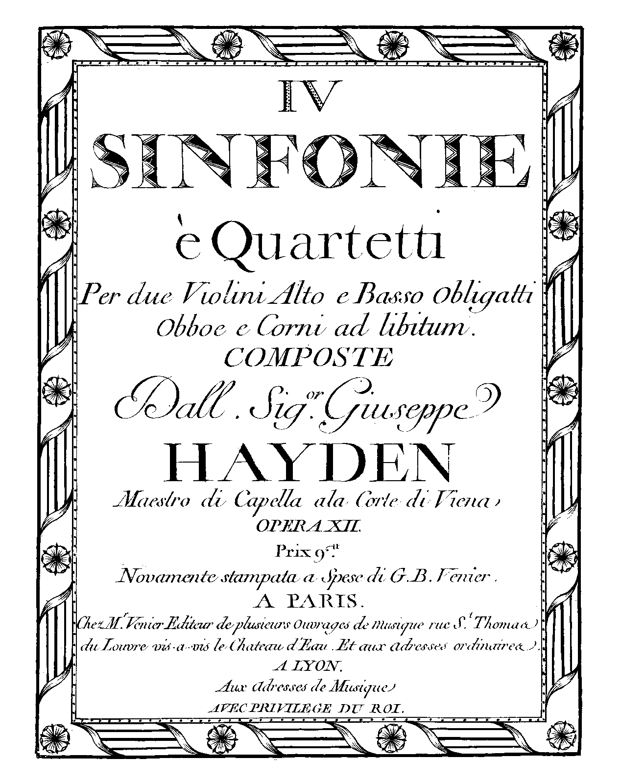 IV Sinfonie e quartetti per due violini, alto e basso obligatti, obboe e corni ad libitum...Opera XII