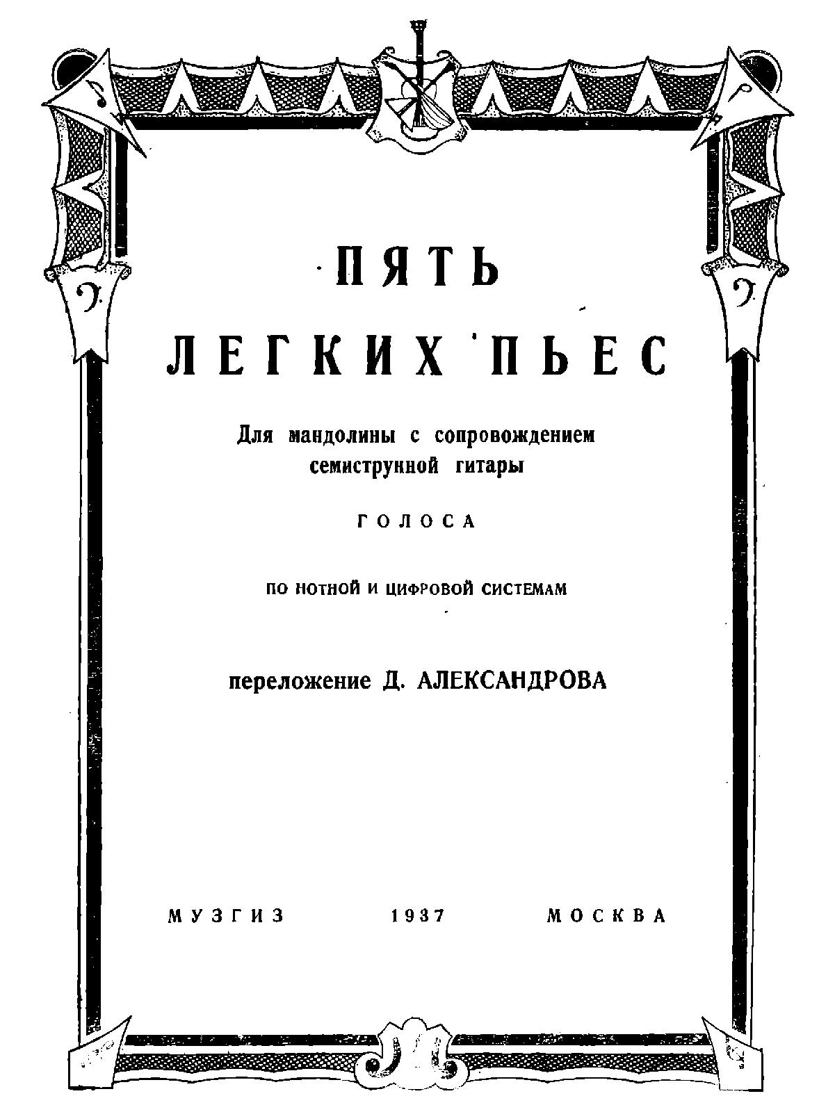 | Alternative. Title | Пять Легких пыес для Мандолины с сопровождением семиструнной гитары |