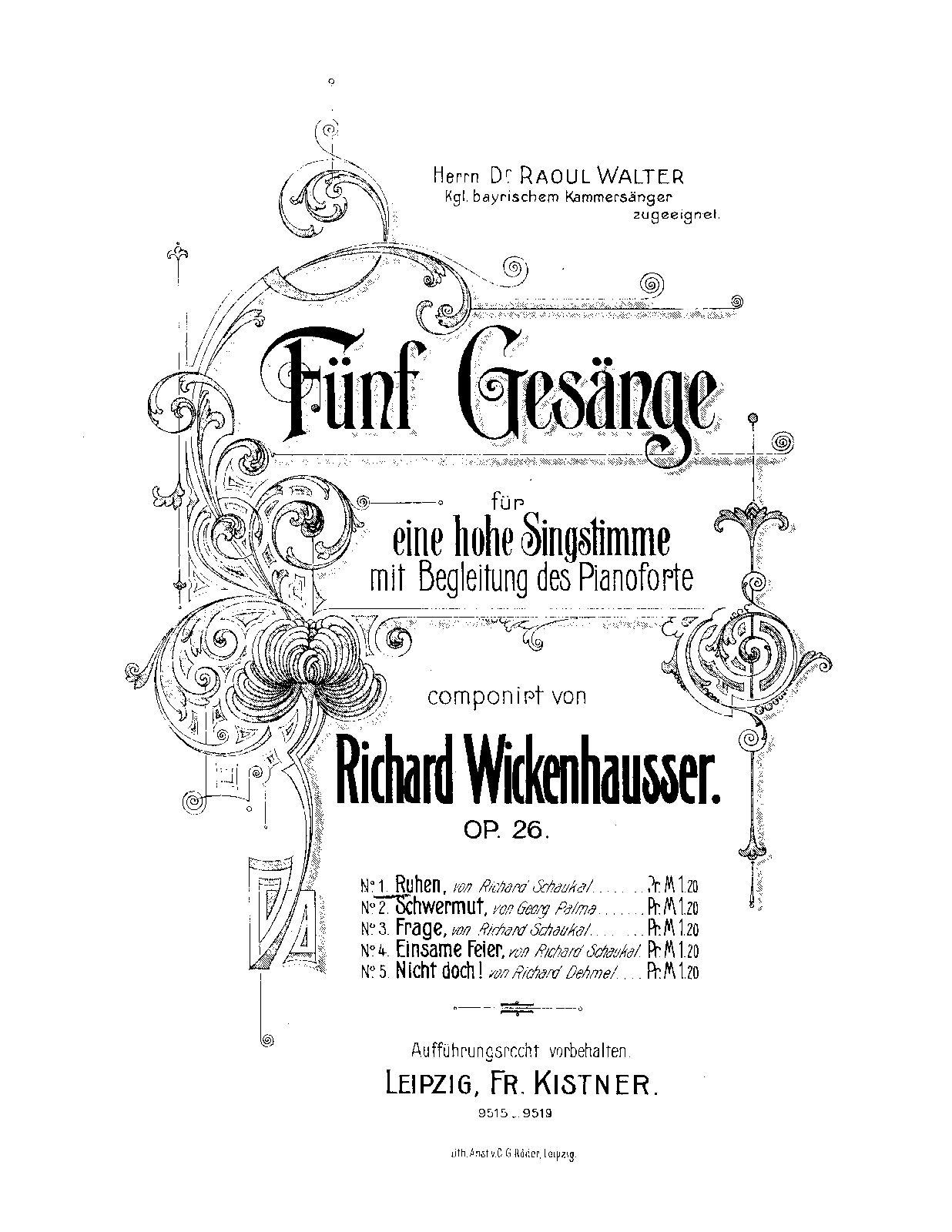 | Dedication | Herrn Dr. Raoul Walter, Kgl. bayrischem Kammersänger zugeeignet |