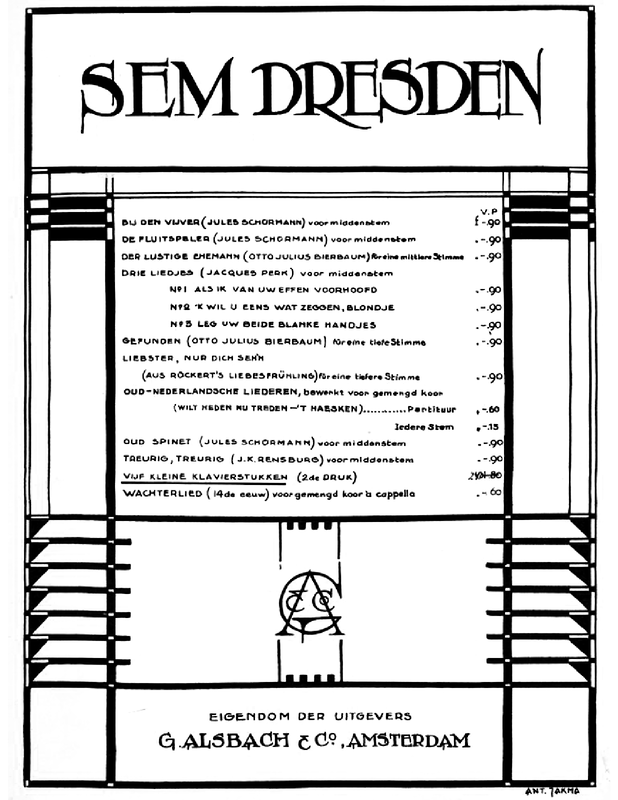From a collection of works by Dresden (listed on the title page)- probably(?) not the first edition. (List includes works published in 1921 such as De Fluitspeler). Alsbach page suggests a mid-1920s? publishing date for this edition.