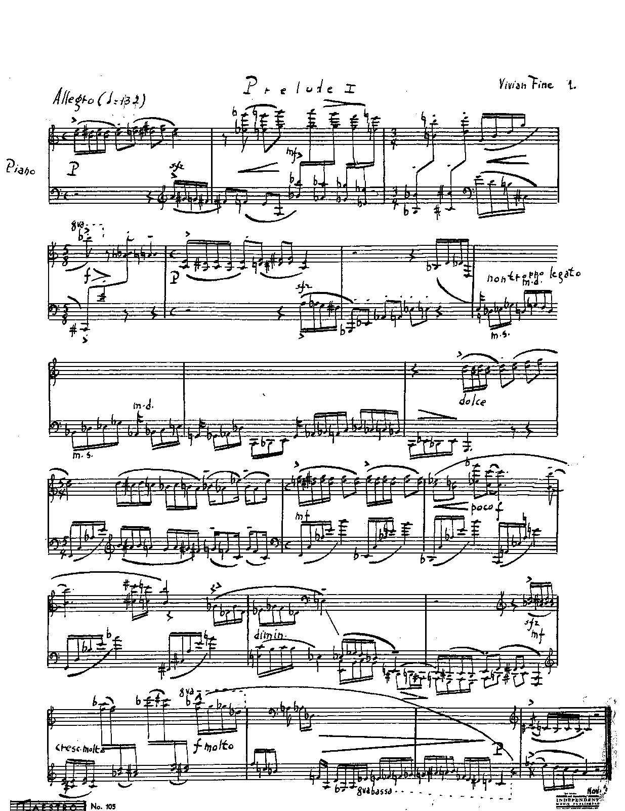The five preludes are short, most one page each, highly technical, and more like etudes than preludes. All, except the last begin tonal and end tonal with many chromatic explorations in between, a procedure Wallingford Riegger later described as ‘tempered atonality.’ Each has a distinctive texture generated by one or two musical ideas….Fine’s compositional technique has become dramatic and terse, due, perhaps, to more command over a restricted use of ideas and more freedom of expression through her work with dancers.