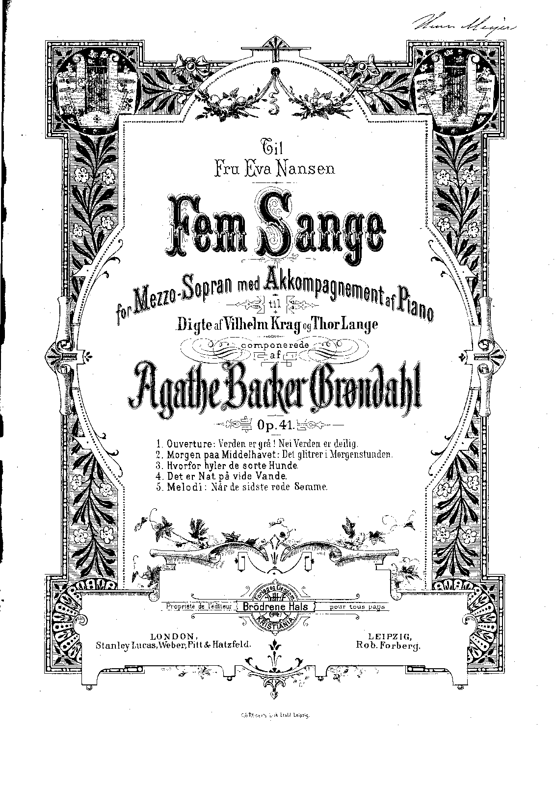 | Librettist | Nos.1-4: Vilhelm Krag (1871-1933) No.5: Translated from Russian by Thor Lange (1851-1915) |