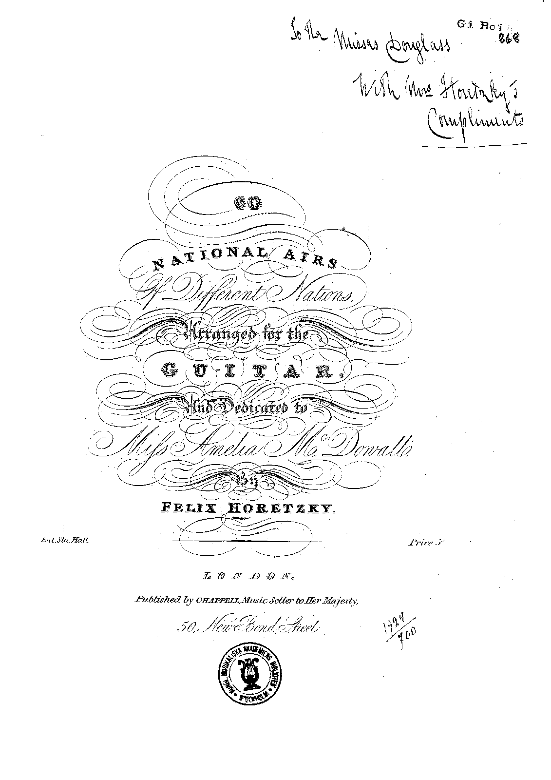 Handwritten dedication: "To the Misses Douglass, with Mr. Horetzky's compliments"