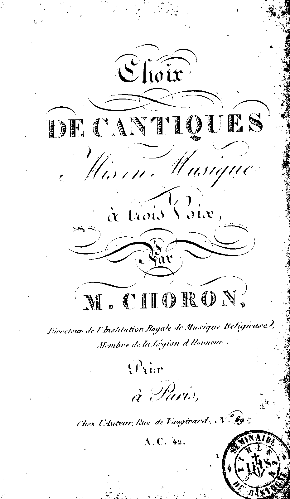 Alternative. Title Choix de Cantiques mis en Musique à trois voix, par M. Choron.