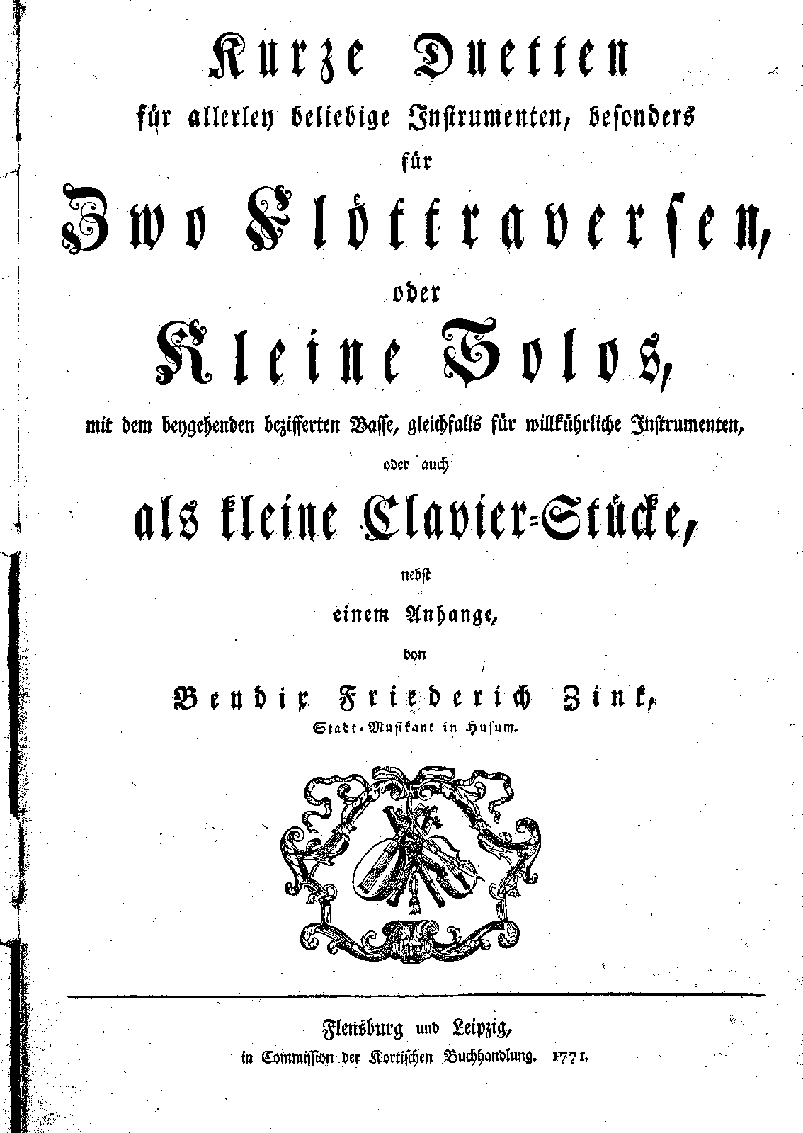Kurze Duetten für allerley beliebige Instrumenten, besonders für Zwo Flöttraversen, oder Kleine Solos, mit der beygehenden bezifferten Basse, gleichfalls für willkührliche Instrumenten, oder auch als kleine Clavier-Stücke, nebst einem Anhange