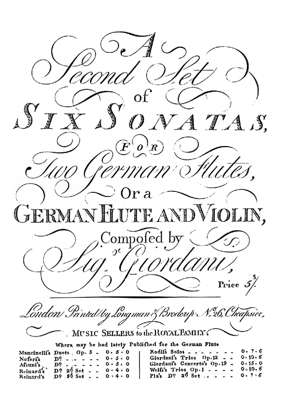 RISM [G 2313 Published in a different order to the cello version. Title: A Second Set of Six Sonatas for Two German Flutes, or a German Flute and Violin