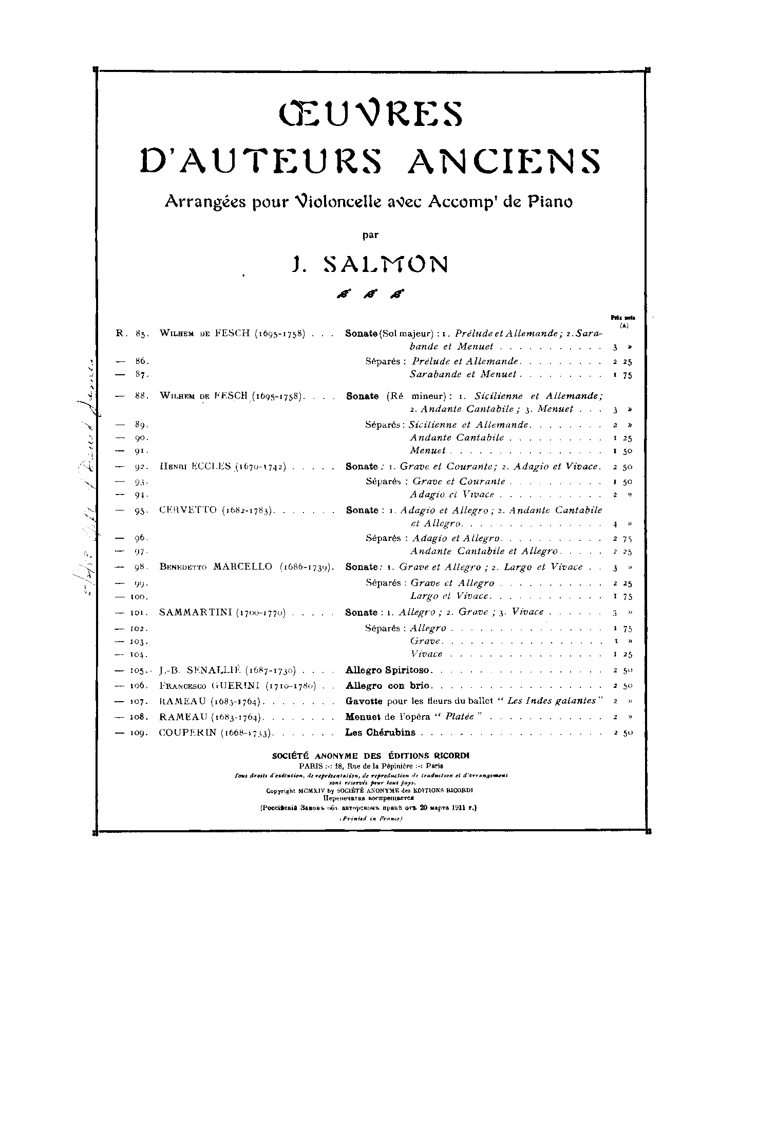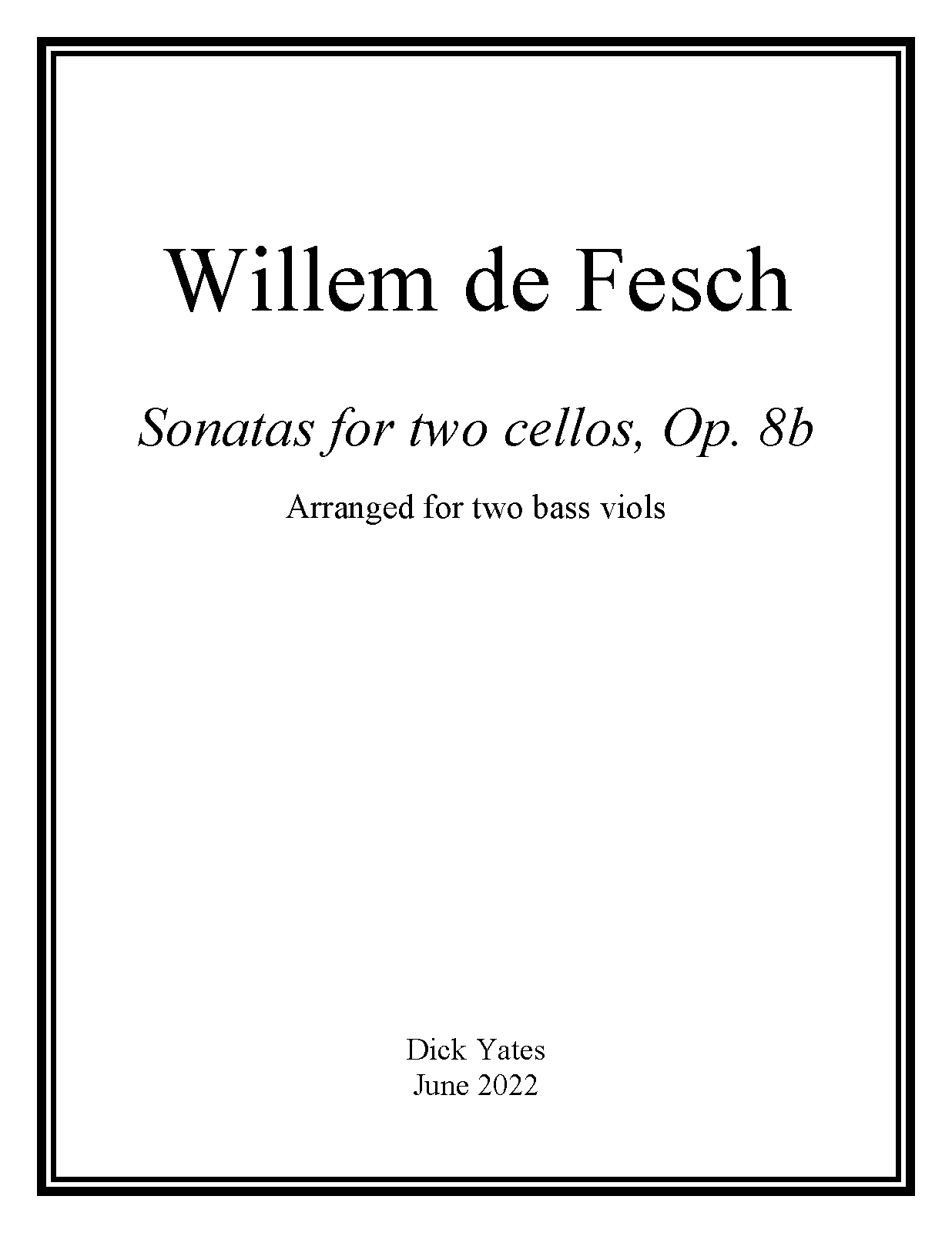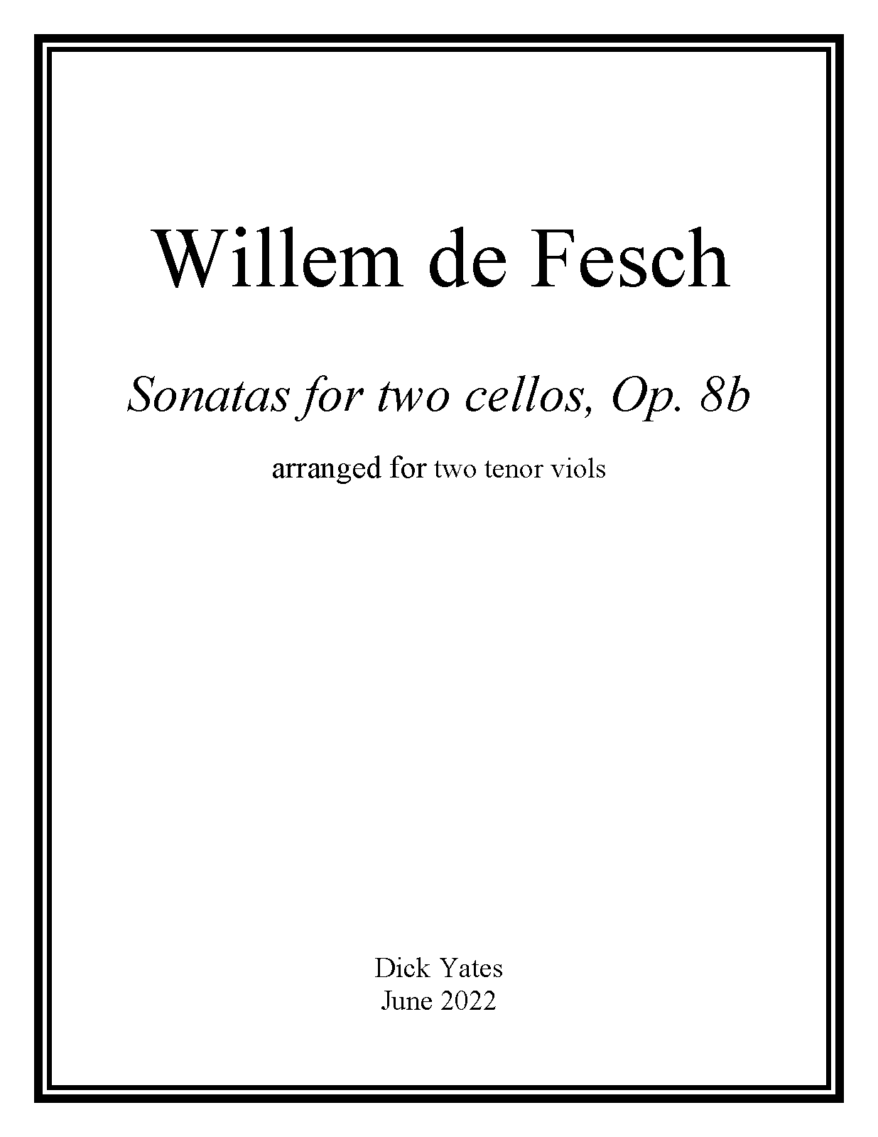 | Extra Information | According to Grove Music, op.8 is actually "XII Sonatas", published in London, 1733. 6 of them are for violin and continuo, the other 6 for 2 cellos and continuo. So the 1736 London publication is not a first edition after all, and most probably an arrangement. The alternate instrumentations (2 bassoons or viols) given in the Paris Boivin edition are probably the publisher's, not De Fesch's. |
