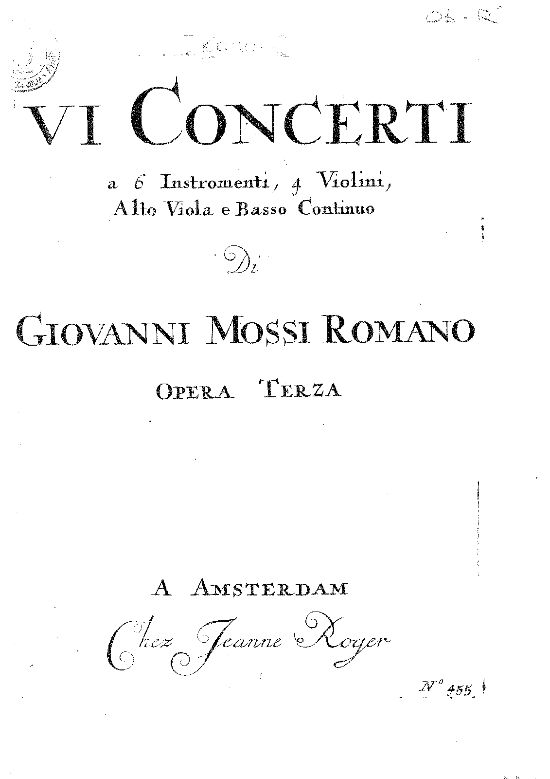 | Alternative. Title | VI Concerti a 6 Instromenti, 4 Violini, Alto Viola e Basso Continuo |