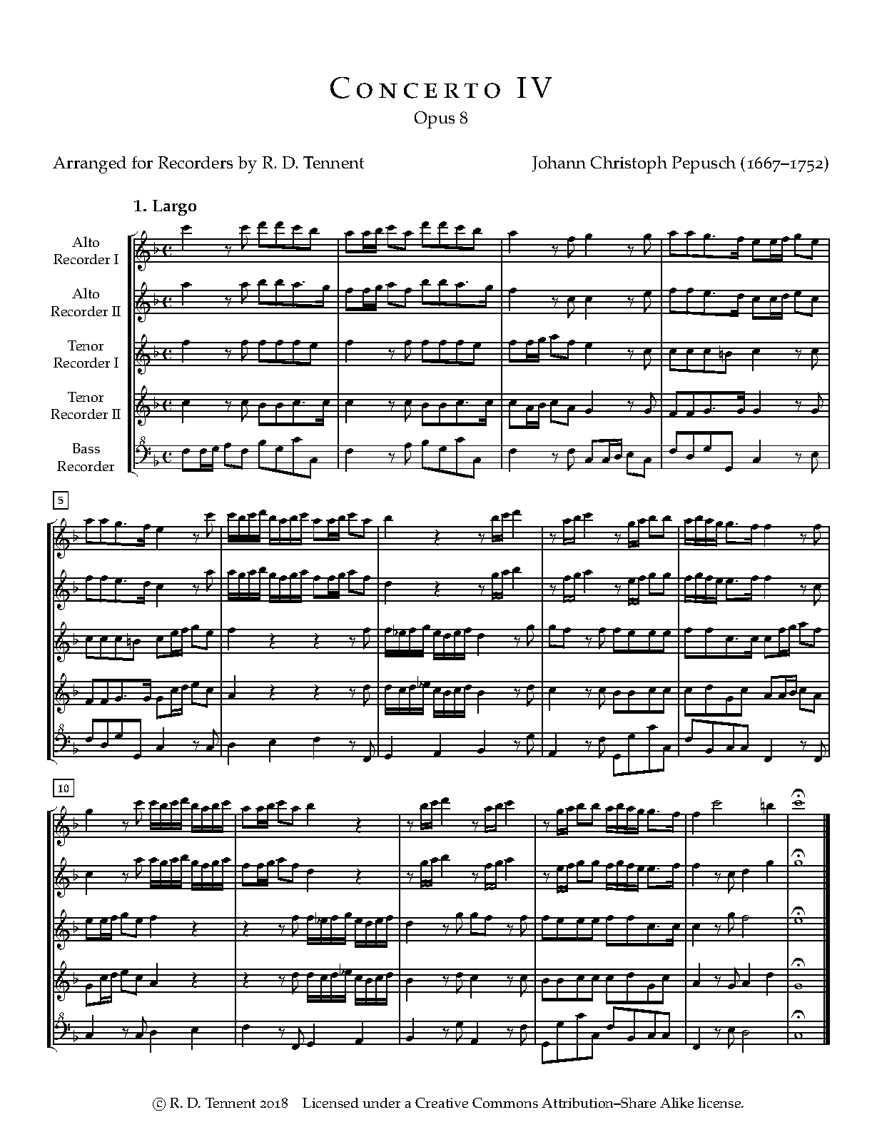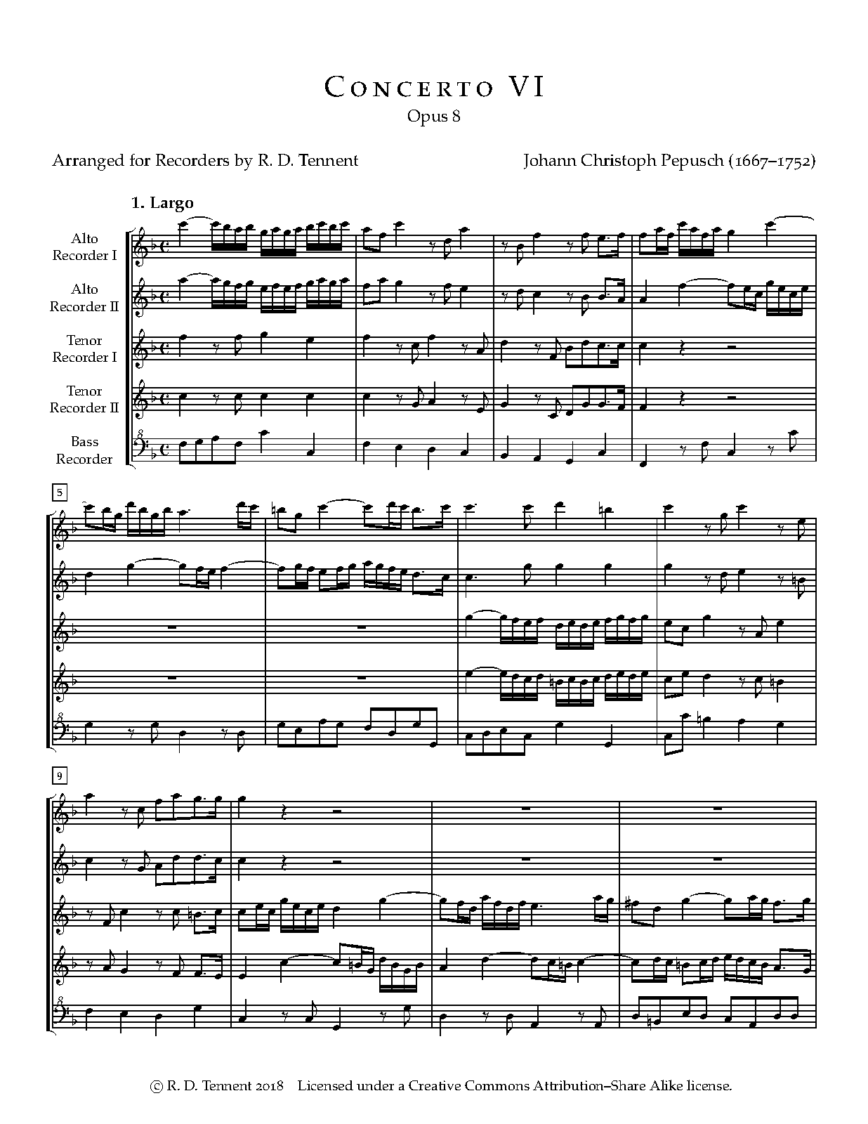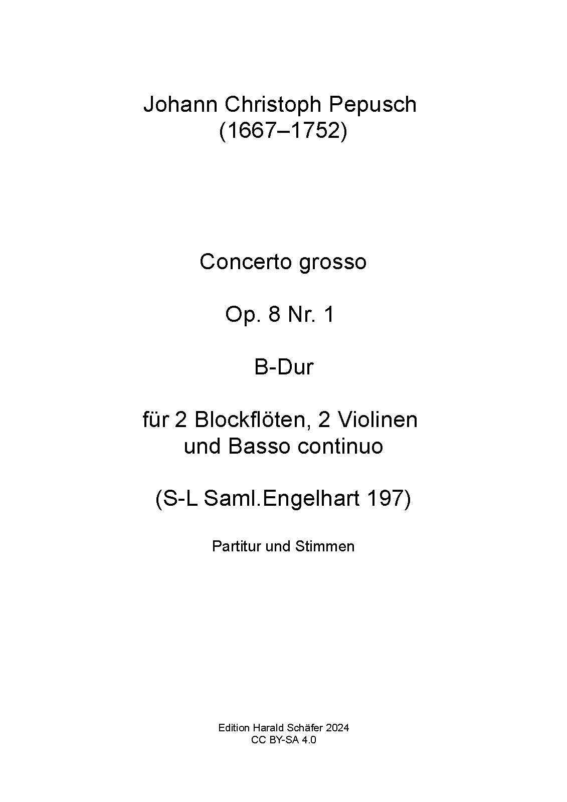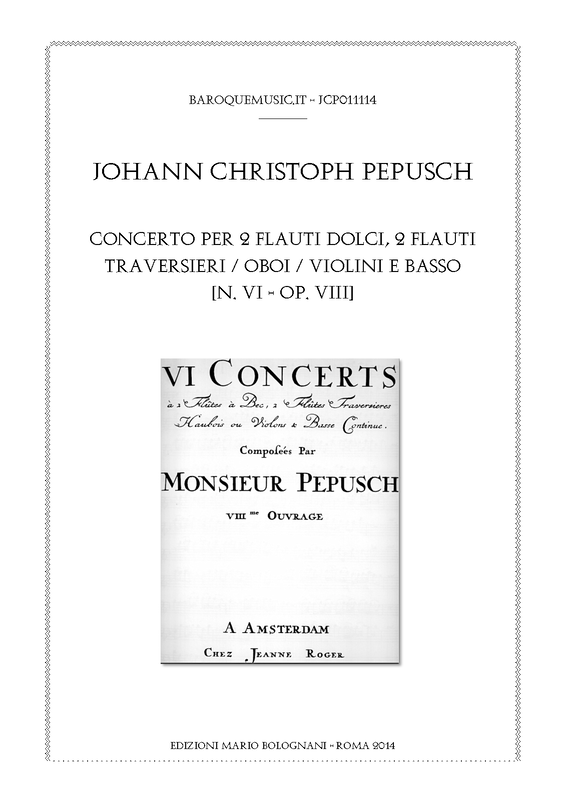 | Extra Information | Grove Music's entry for the op.8 set is: "VI concerts, 2 rec, 2 fl/ob/vn, bc (Amsterdam, ca.1717–18) [not all playable with this scoring] ed. D. Lasocki (London, 1974). "In all 6 Concertos, the upper pair of parts are headed Flauto Primo and Flauto Secundo, the lower Hautbois Primo and Hautbois Secundo. The usual treble recorder can´t take part in Concertos 2 and 3, which reach below f´." |