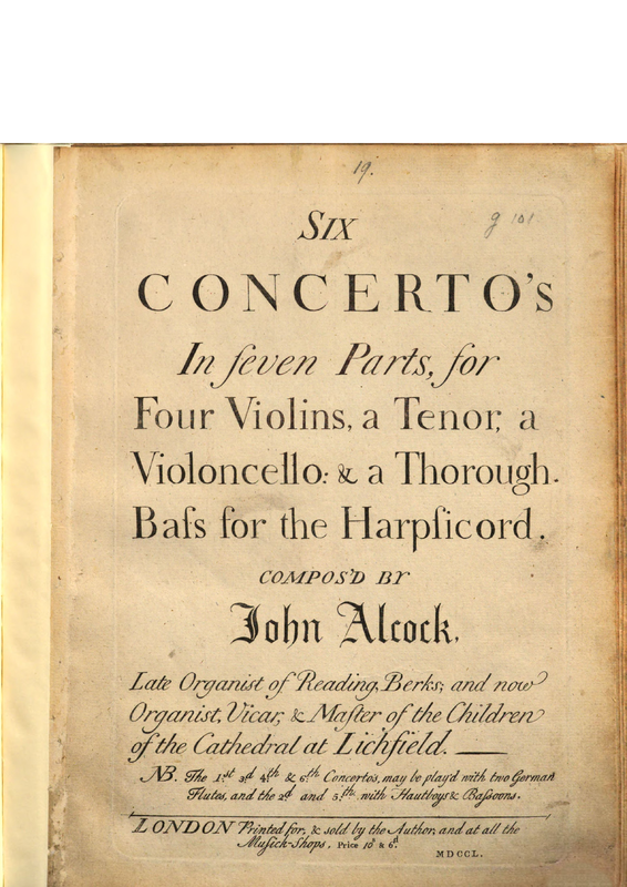 | Alternative. Title | Six Concerto's in seven Parts, for Four Violins, a Tenor, a Violoncello: & a Thorough Bass for the Harpsicord. ... N.B. The 1st. 3d. 4th. & 6th. Concerto's may be play'd with two German Flutes, and the 2d. and 5th. with Hautboys & Bassoons. |