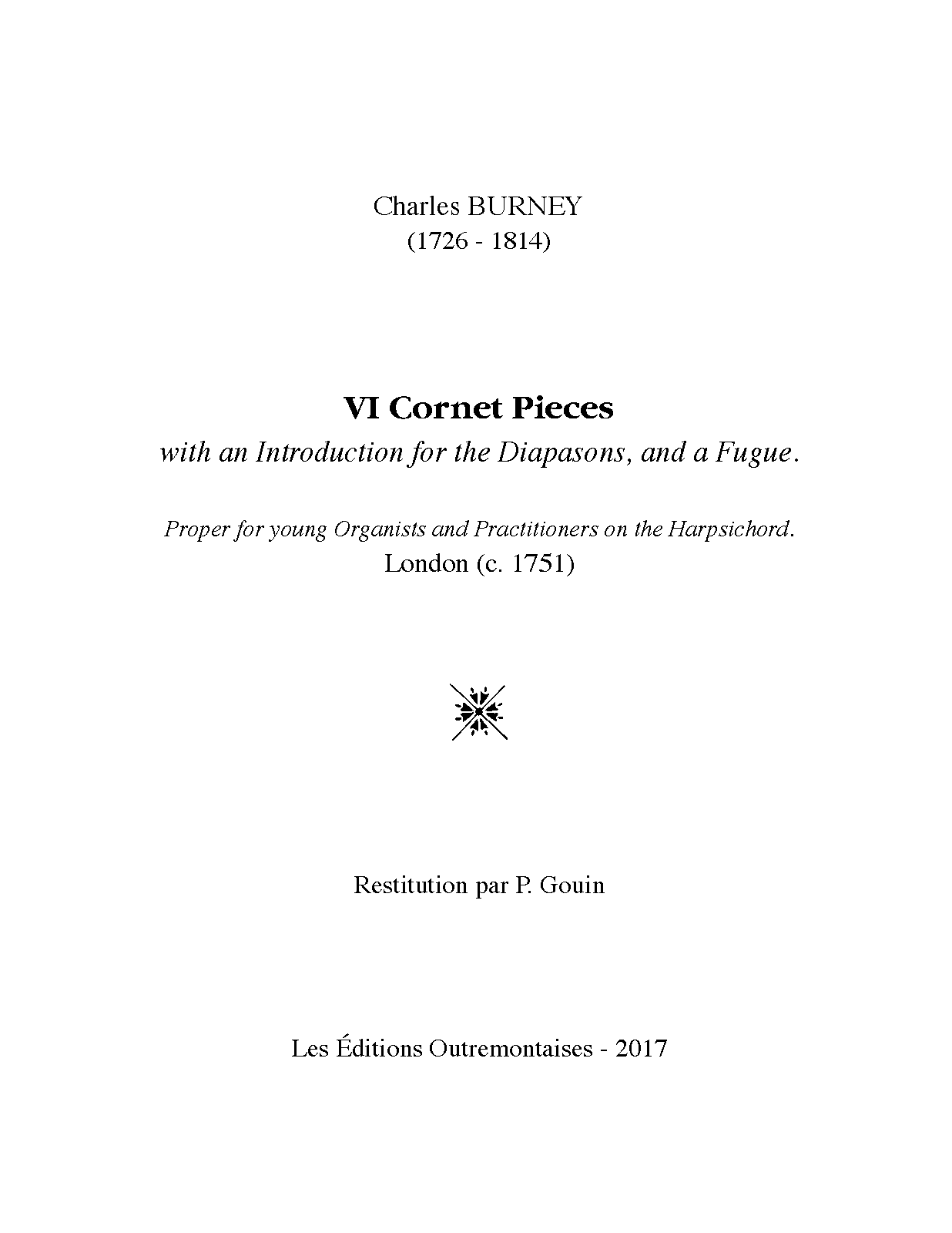 - VI Cornet Pieces with an Introduction for the Diapasons, and a Fugue. Proper for young Organists and Practitioners on the Harpsichord.</span>