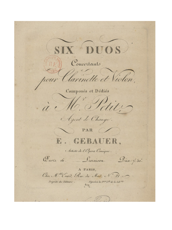 | Genre Categories | Duets; For clarinet, violin; Scores featuring the clarinet; |