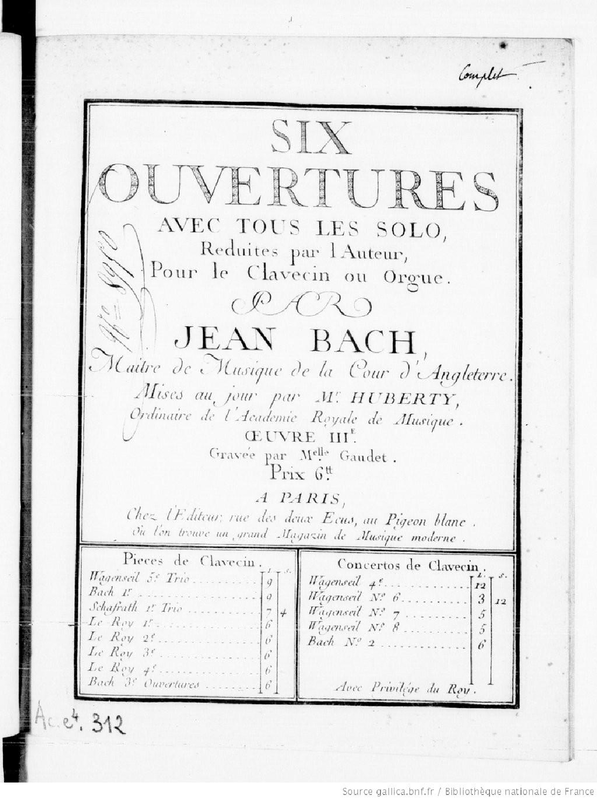 "Contains overtures (1-3) from the operas Orione, Zanaida, and Artaserse; overtures 4-5 are contributions by J.C. Bach to the pasticcios La Cascina and Astarto; the 6th overture is not identified by Warburton as by J.C. Bach, with an alternative attribution given to Baldassare Galuppi (Warburton LA Inc 1, and YC 28; all 6 arrangements are attributed to J.C. Bach. (cf. Warburton, Ernest. The collected works of Johann Christian Bach. Part one, Thematic catalog, 1999)." WorldCat