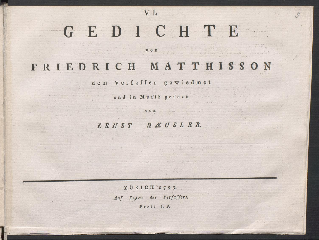 | Alternative. Title | VI Gedichte von Friedrich Matthisson dem Verfasser gewiedmet und in Musik gesezt von Ernst Haeusler |