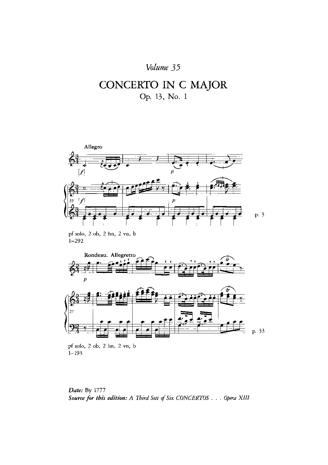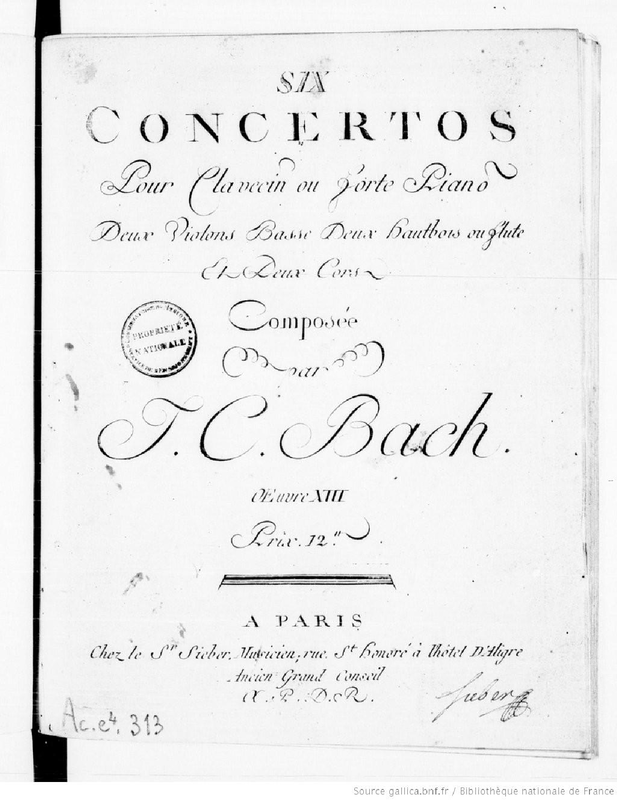First publication noted in Warburton: 1777, London: John Welcker and some others from about the same time (Sieber pub. is dated by Warburton (pp.120-121 of Thematic Catalog) to 1777 also. Warburton gives "composed by March 1777" for the concertos in the set.