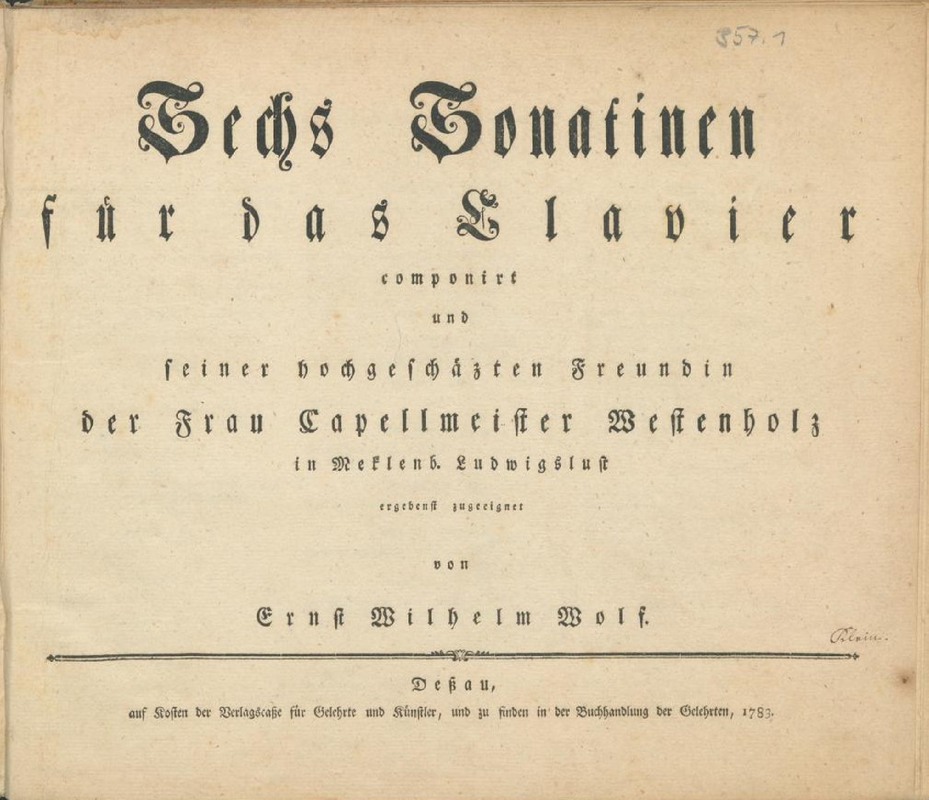 | Dedication | Frau Capellmeister Sophia Maria Westenholz |