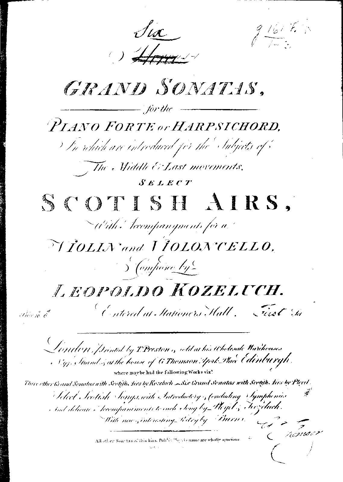 Scottish trios; Grand Sonatas, for the Piano Forte or Harpsichord, In which are introduced for the Subjects of The Middle & Last movements, Select Scotish Airs, With Accompanyments for a Violin and Violoncello