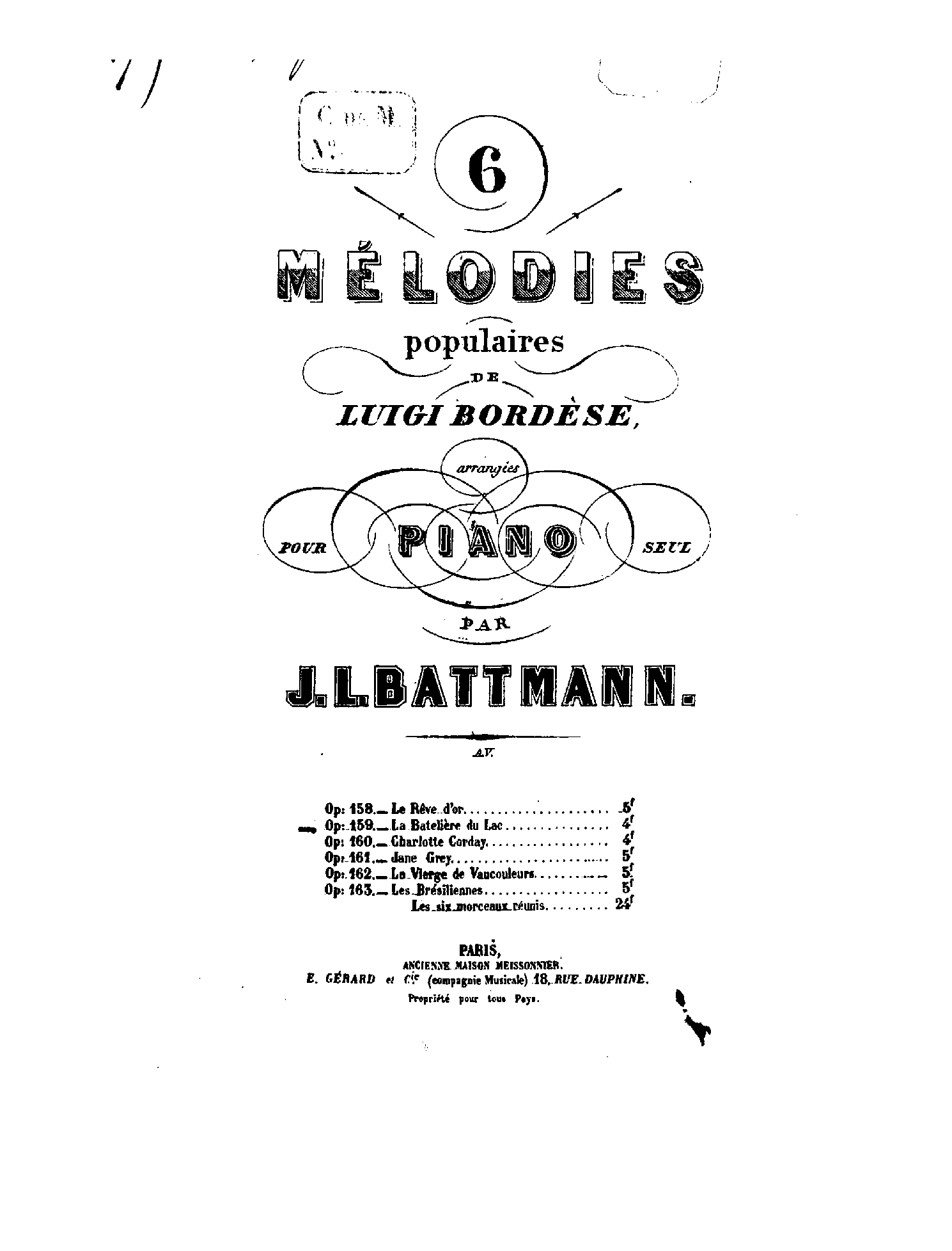 | Work Title | Six mélodies populaires de Luigi Bordèse arrangées pour piano seul |